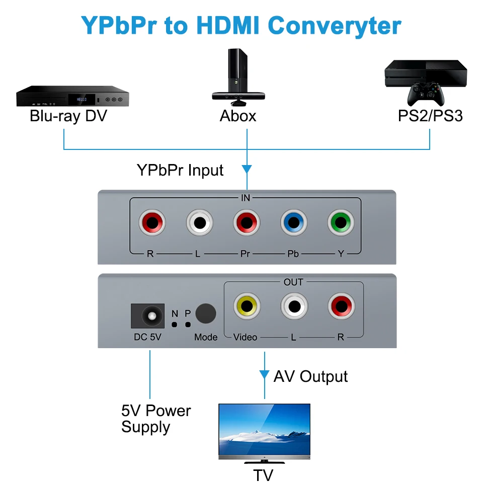 -- ConvertirYPbPr/RGB + R/LSeñal a señal AV + Audio R/L;