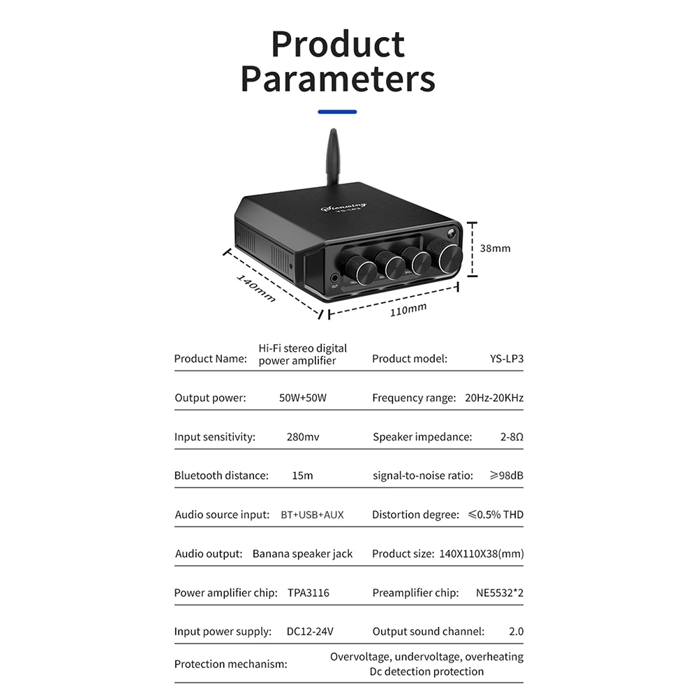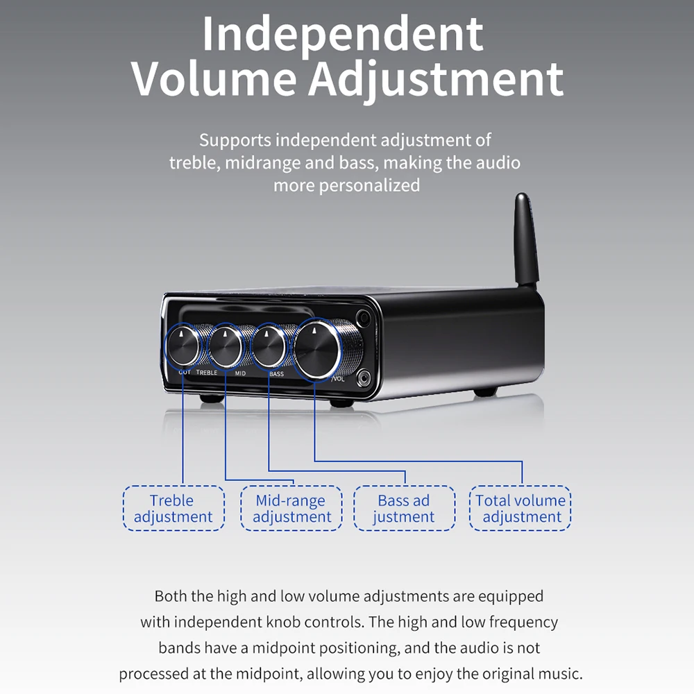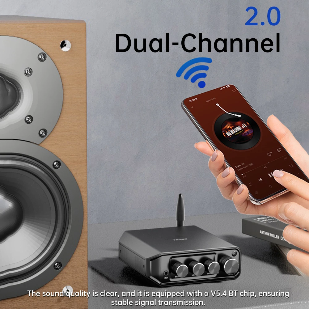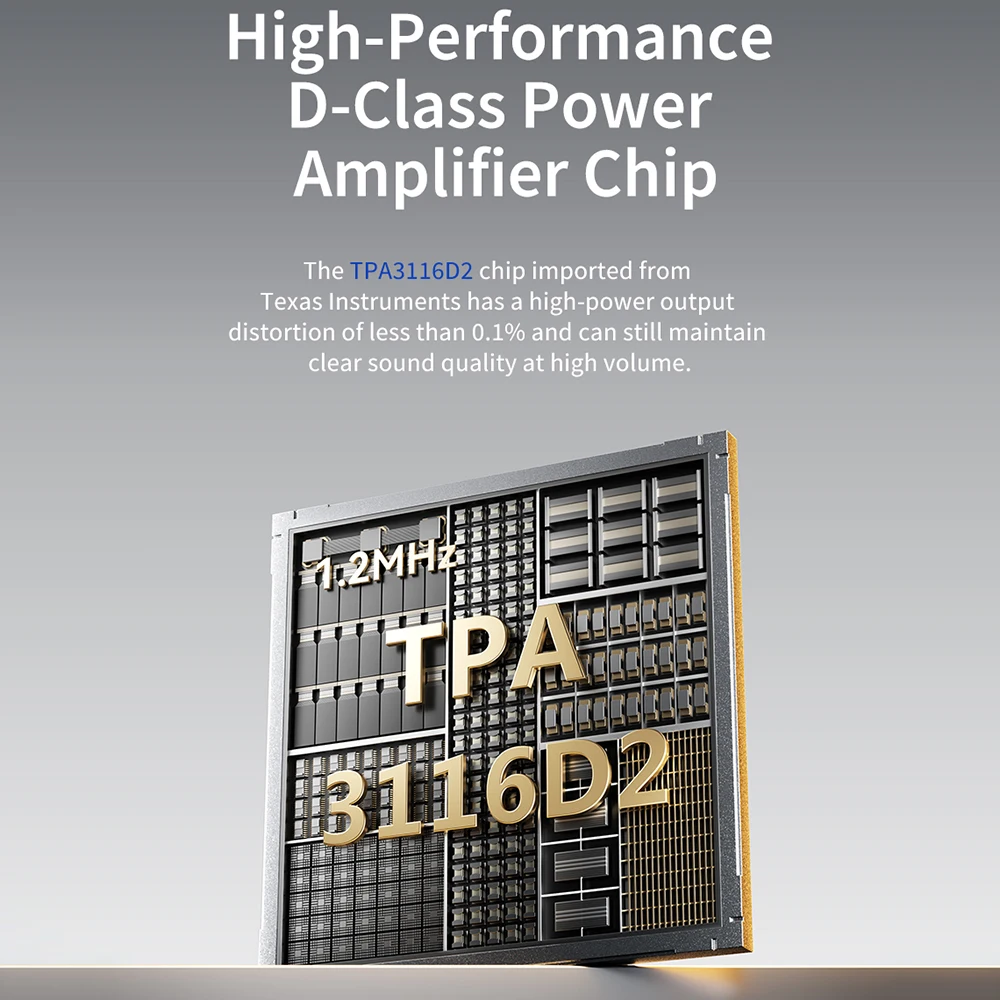 Características:1.Carcasa de aleación de zinc, tecnología de alta gama y antioxidante resistente a la corrosión; Tecnología de amplificador Hi-Fi de alta fidelidad, doble canal 2.0, calidad de sonido clara, fuerte sensación de espacio, experiencia inmersiva2. Chip amplificador clase D de alto rendimiento: chip TPA3116D2, frecuencia de modulación de hasta 1,2 MHZ, para garantizar la transmisión precisa de señales de audio3.Equipado con chip BT V5.4 para estabilizar la transmisión de la señal, la distancia de conexión puede ser de hasta 15 metros; diseño de circuito que utiliza dos amplificadores operacionales duales NR55324.Función de protección cuádruple: protección de circuito de detección de sobretensión, subtensión, sobrecalentamiento, CC; 3 modos de entrada: BT, disco U, interruptor AUX a voluntad5.Ajuste de volumen independiente, con perilla de control de agudos, medios y graves; Puerto de entrada RCA, para lograr separación de transmisión de audio y vídeo.Parámetro: