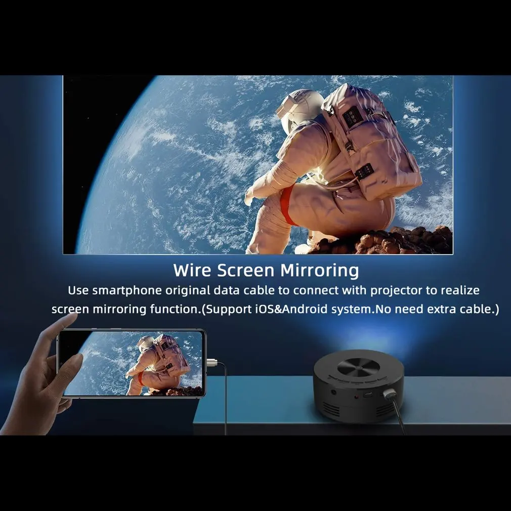 2. Proyección de pantalla con cable: Utilice el cable de datos del teléfono inteligente para conectar el proyector y realizar la función de proyección de pantalla, y es compatible tanto con sistemas iOS como Android. Puedes probarlo. Diseño innovador, combinación perfecta de moda y arte, utilizando material plástico ABS, resistente al desgaste, larga vida útil.
