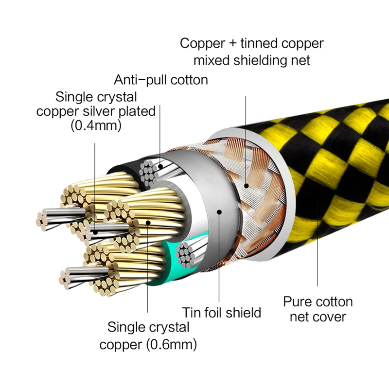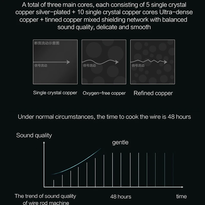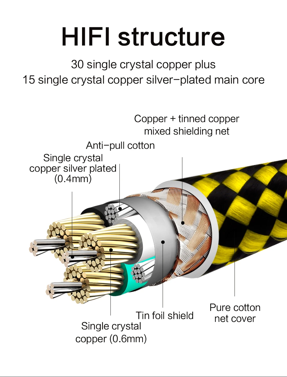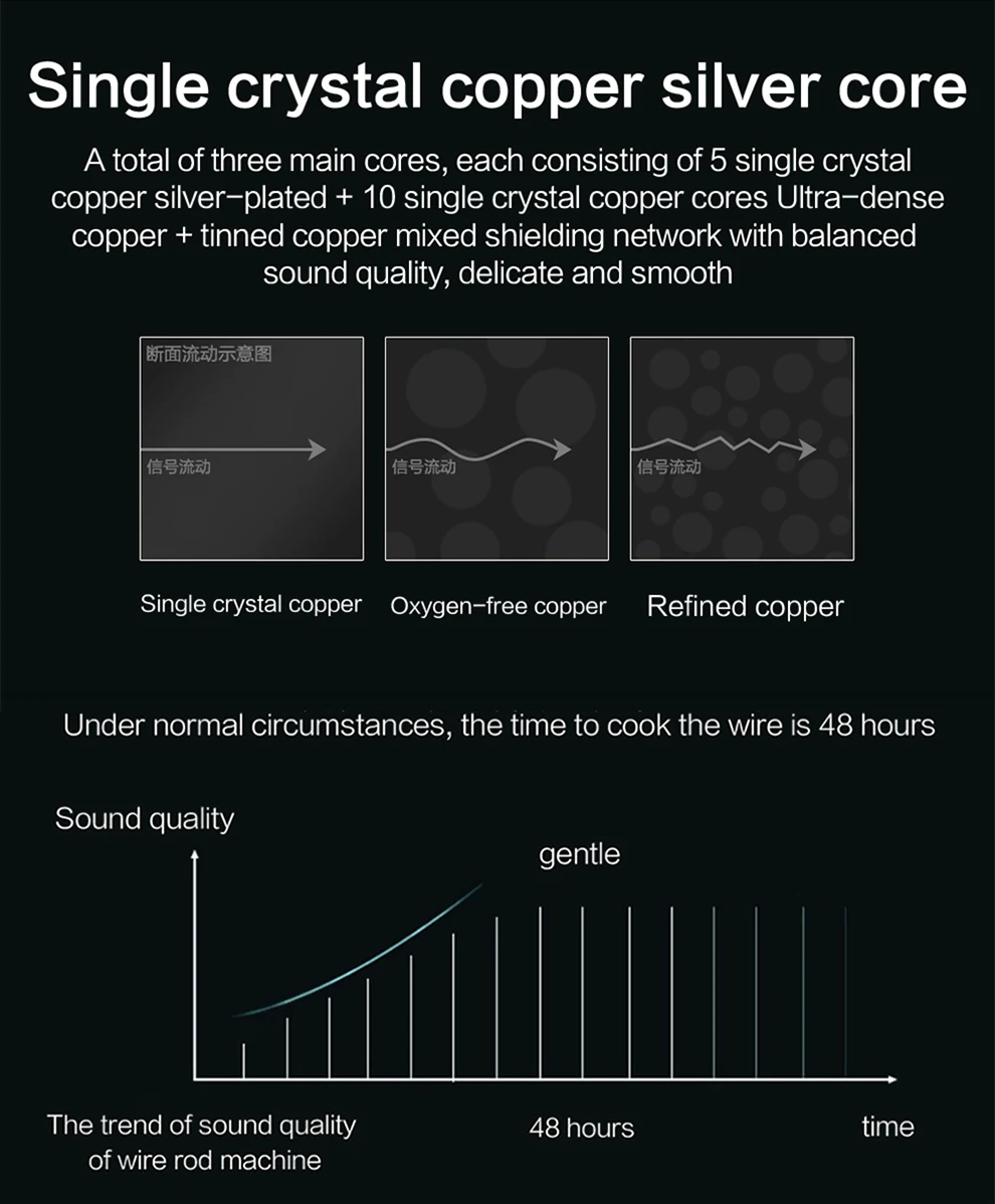 Núcleo de plata de cobre de un solo cristal Atotal de tres núcleos principales, cada uno compuesto por 5 cobre de un solo cristal plateado + 10 núcleos de cobre de un solo cristal Ultra-denso cobre + red de blindaje mixto de cobre estañado con calidad de sonido equilibrada, delicado y suave