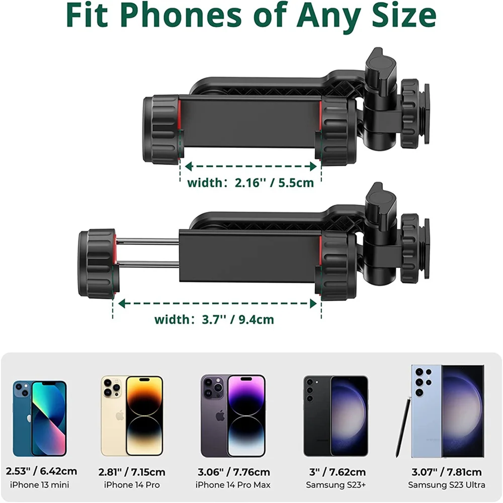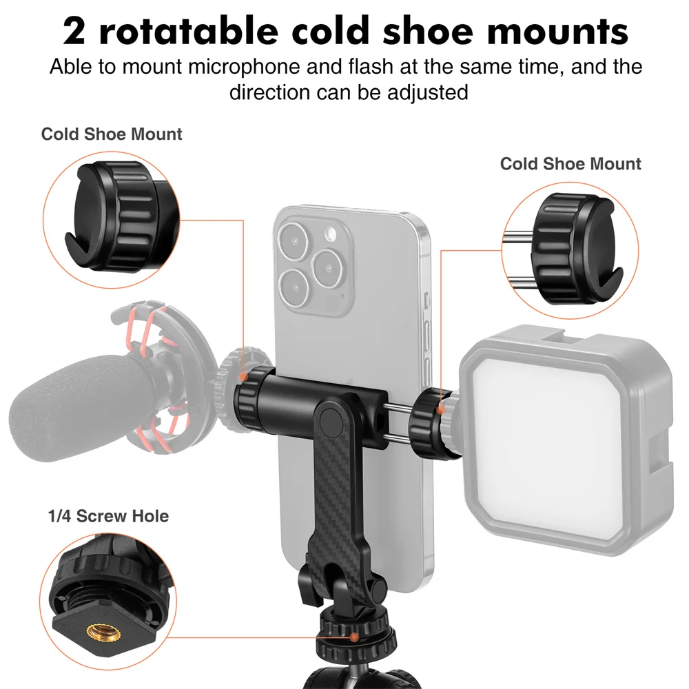 【2 Cold Shoe Mount & 1/4'' Screw Thread】The mobile phone tripod mount is equipped with two cold shoe mounts, allowing you to attach microphones, photography lights, and other accessories. Additionally, the cold shoe mounts can be easily rotated to adjust the angle of your equipment.Also features a standard 1/4'' screw hole, making it compatible with tripods, selfie sticks, monopods, cameras, stabilizers, video sliders, ring lights, handle grips, and other accessories.