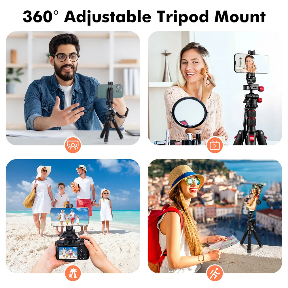 【Newest Phone Tripod Mount】Cell Phone Mount Tripod design with 360° Rotatable, you can attach extra LED light, microphone or other filming equipment. It helps to record steady vlogging videos for Facebook, Youtube and platforms and live streaming channels.