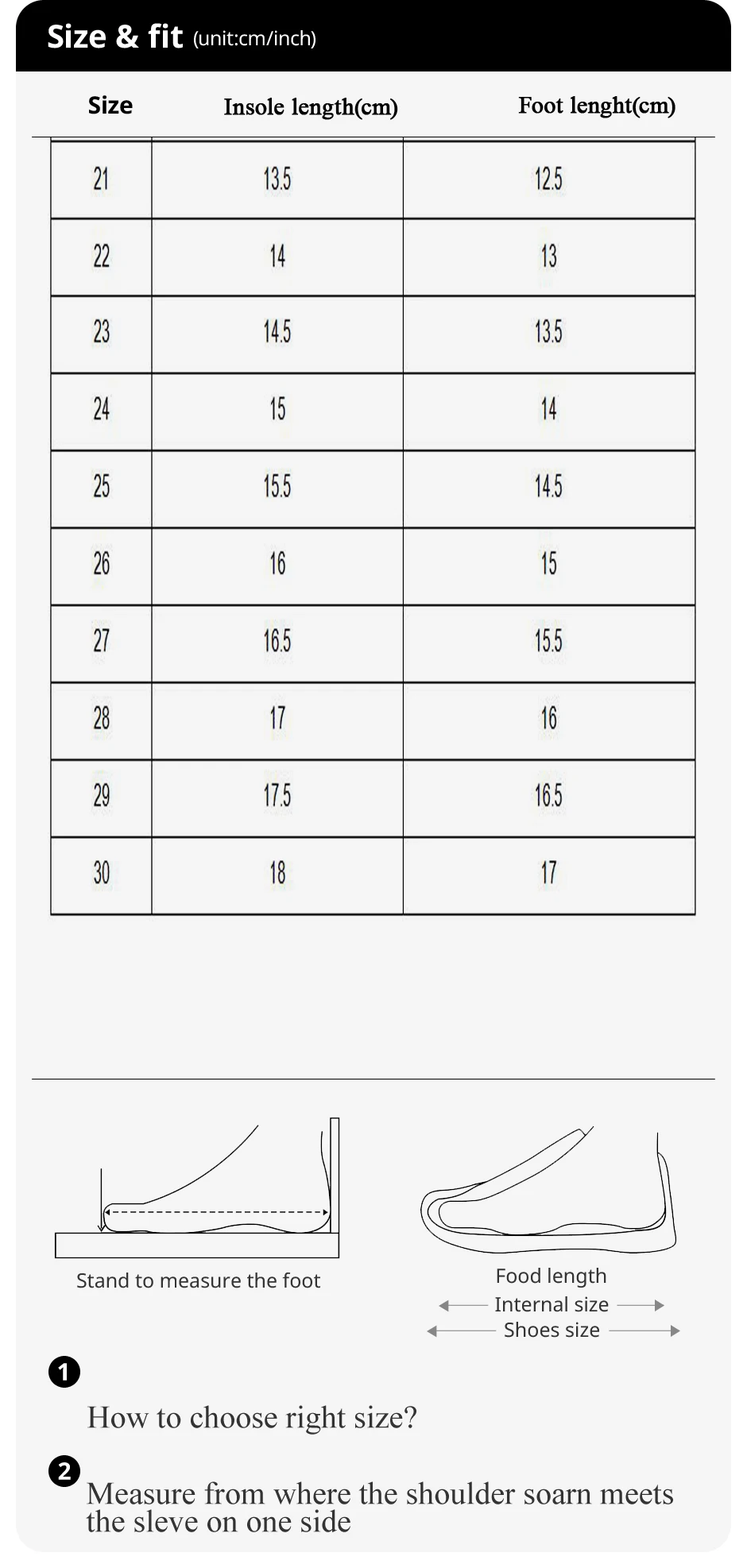 Por favor, mida la longitud del pie de su hijo y agregue 1cm para elegir su tamaño.