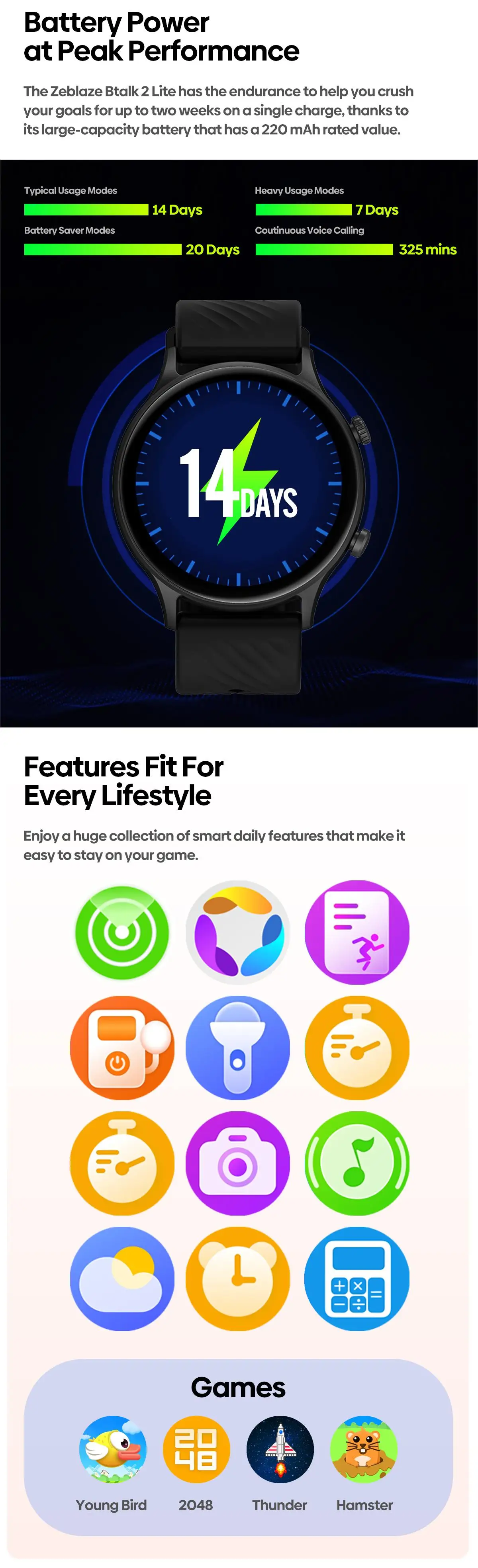 Other Functions: Games, Calculator, Low Power Modes.