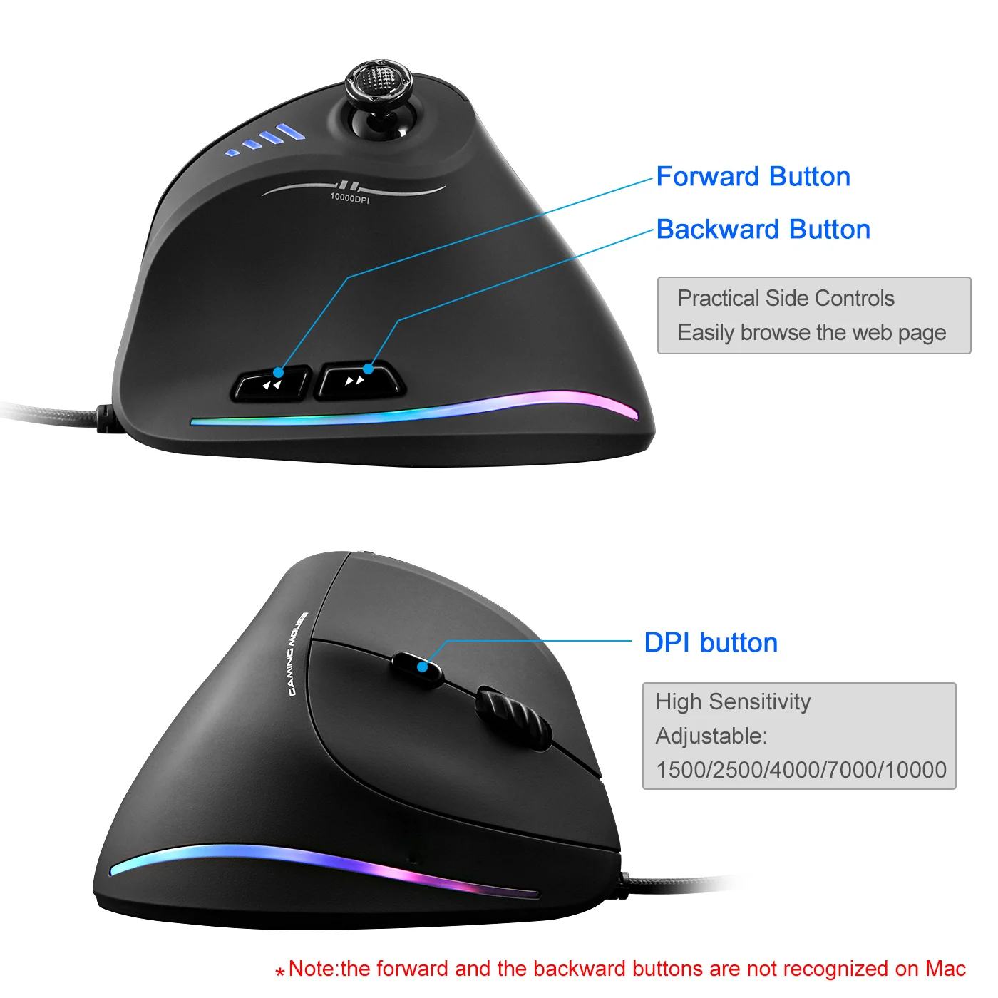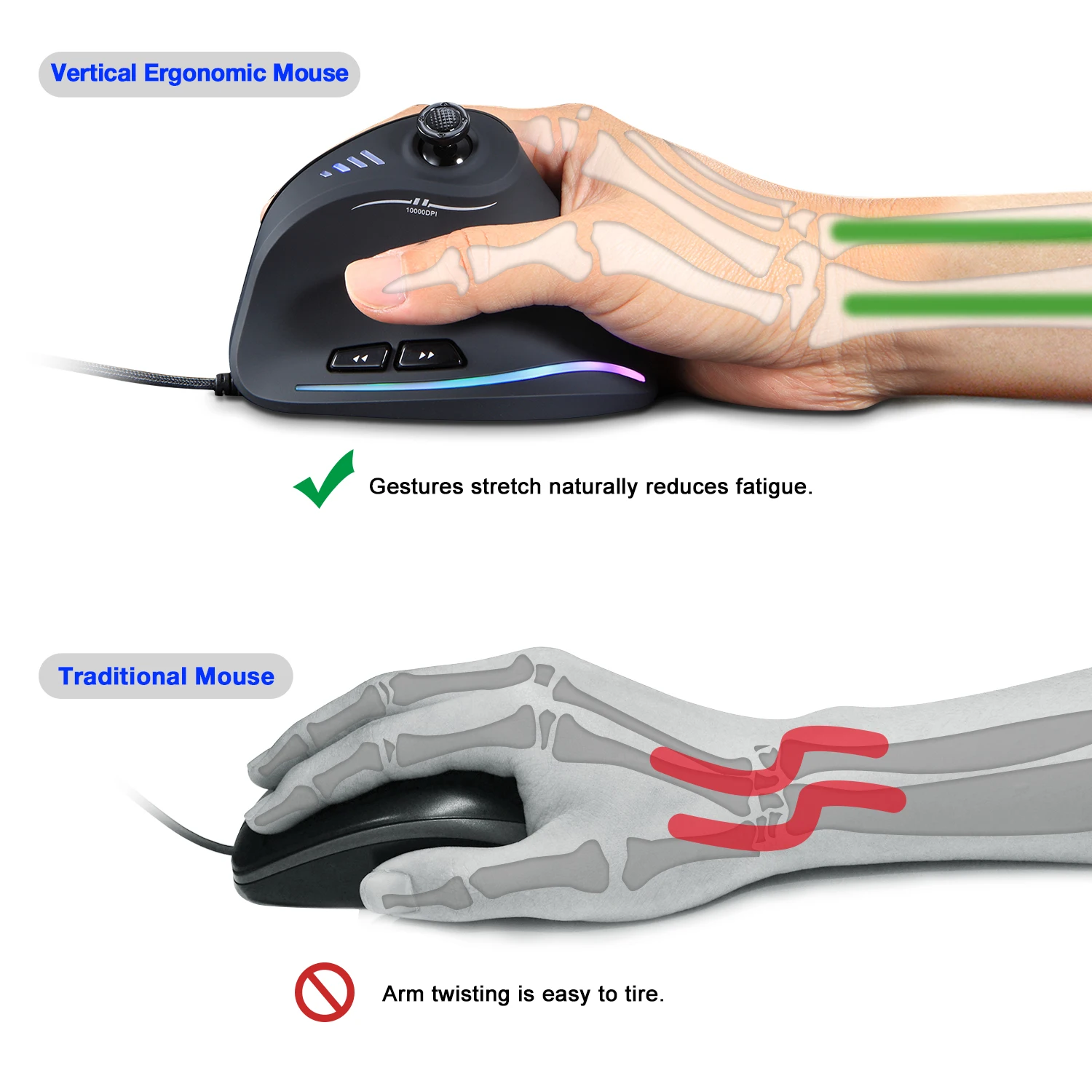 Ratón Vertical Lefon para juegos, ratón ergonómico RGB con cable, ratón para juegos láser programable, 10000 DPI actualizado para jugadores