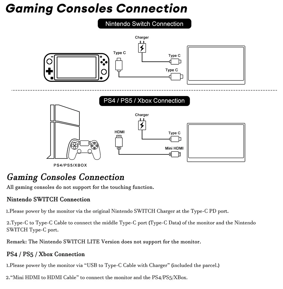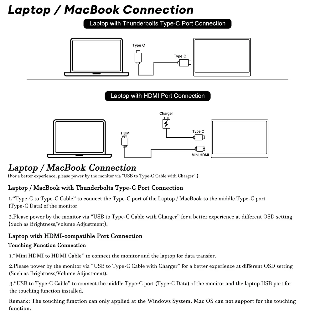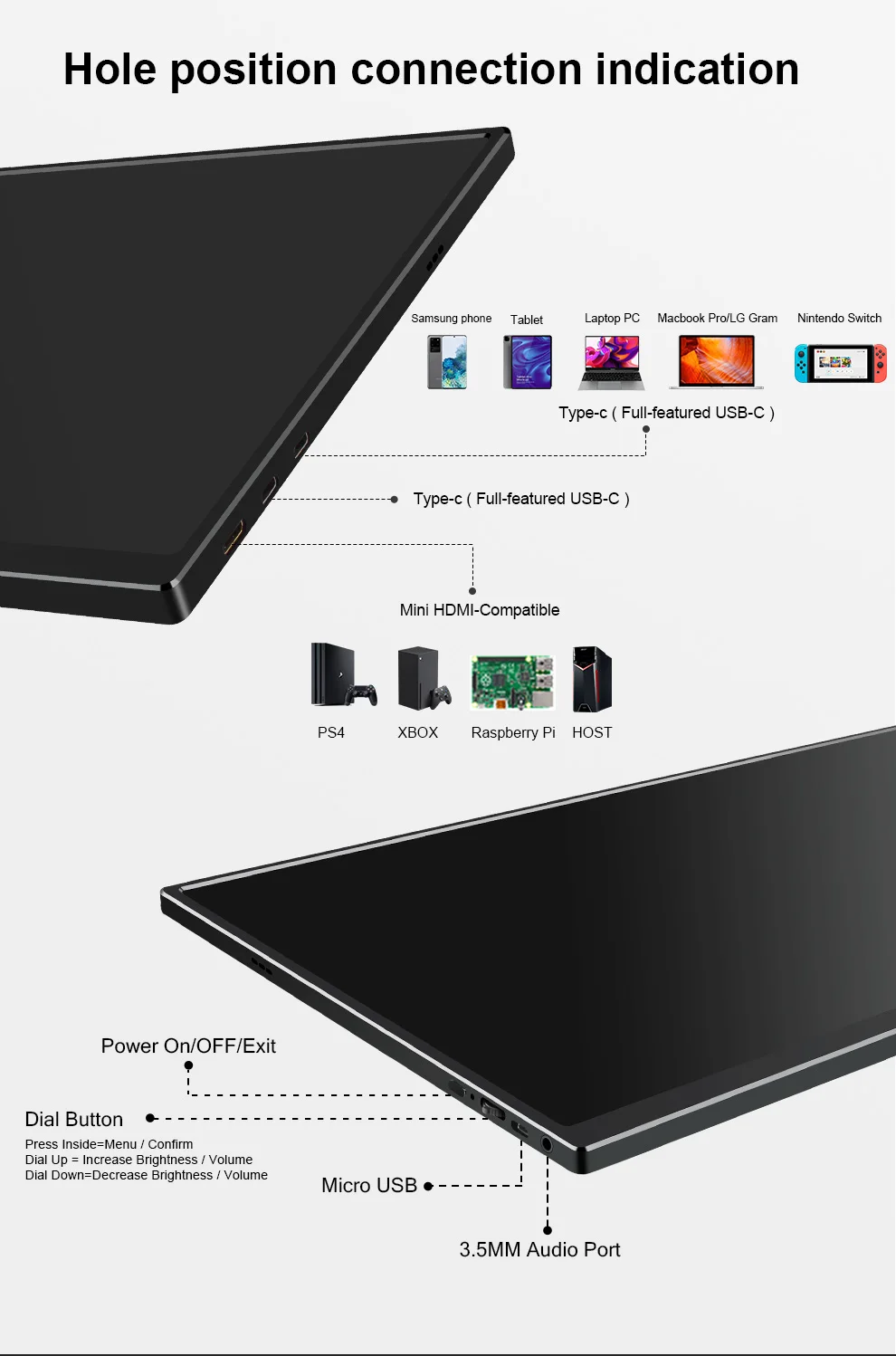 R: Todos estos dispositivos están conectados al monitor mediante una conexión compatible con HDMI.Primero: alimentación del monitor con el cargador incluido (conecte el puerto pd tipo c); En segundo lugar, cable Mini HDMI a HDMI para conectar el dispositivo y el monitor.