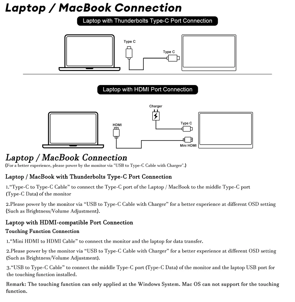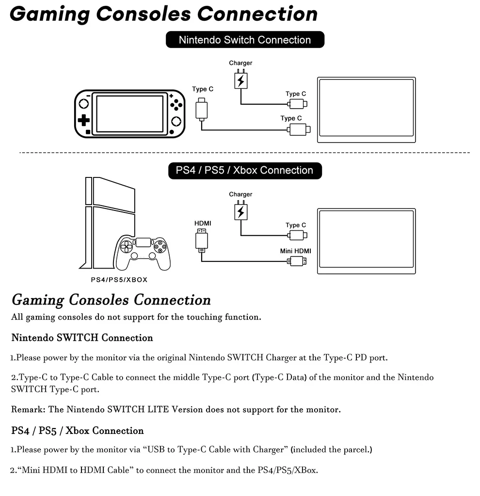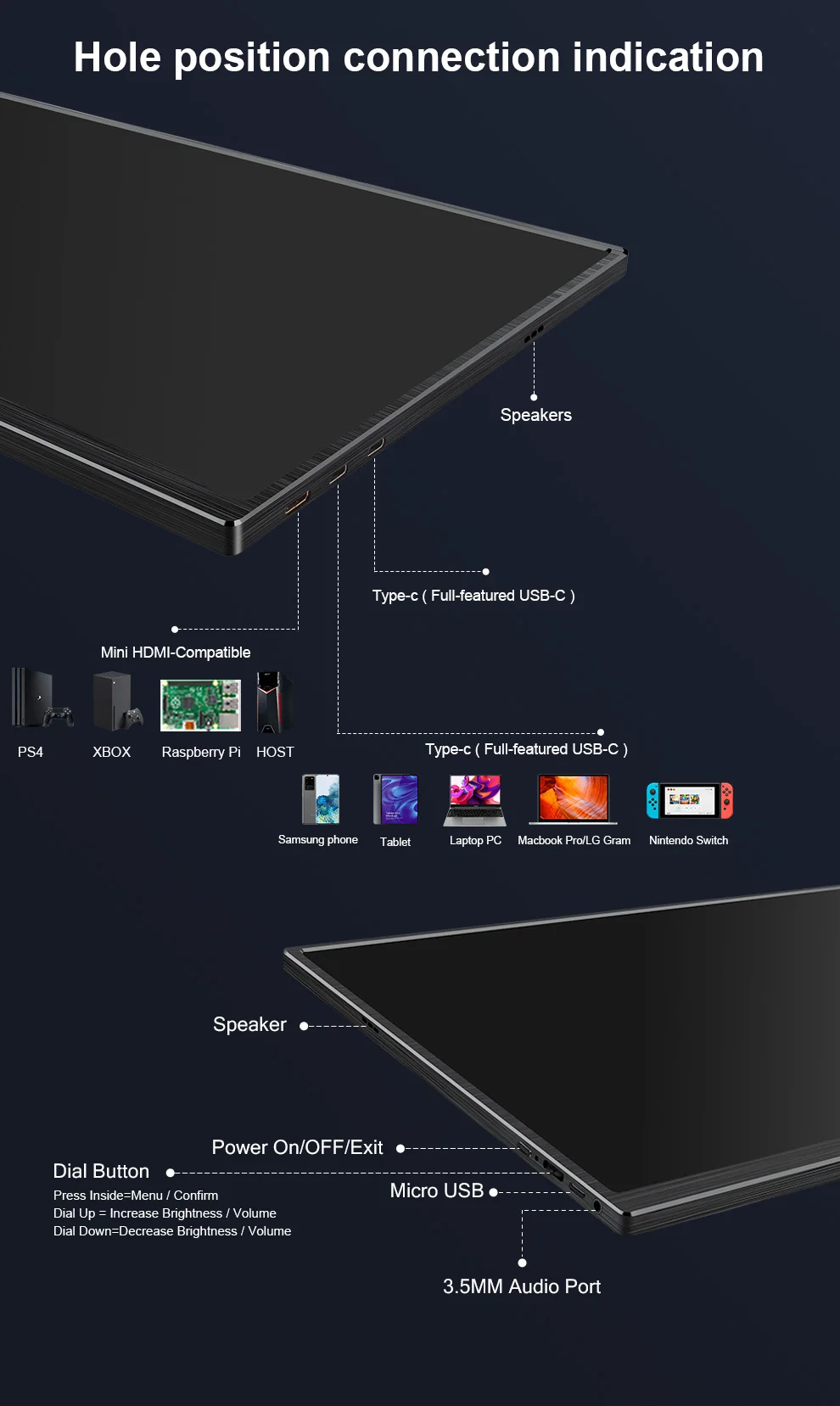 R: Todos estos dispositivos están conectados con el monitor a través de una conexión compatible con HDMI. Primero: alimentación por el monitor con el cargador incluido (conecte el puerto PD tipo C); En segundo lugar, Mini cable compatible con HDMI para conectar el dispositivo y el monitor.