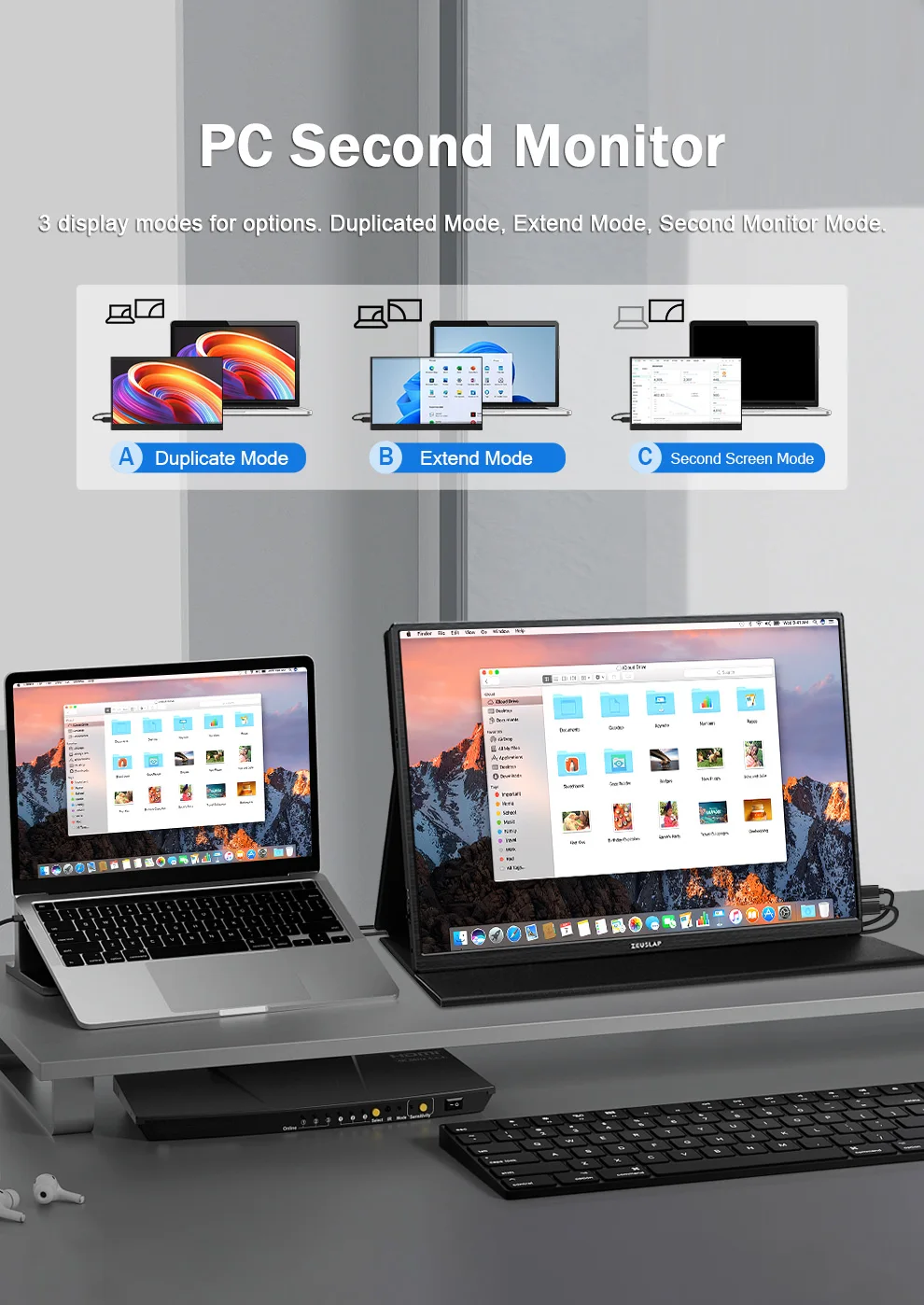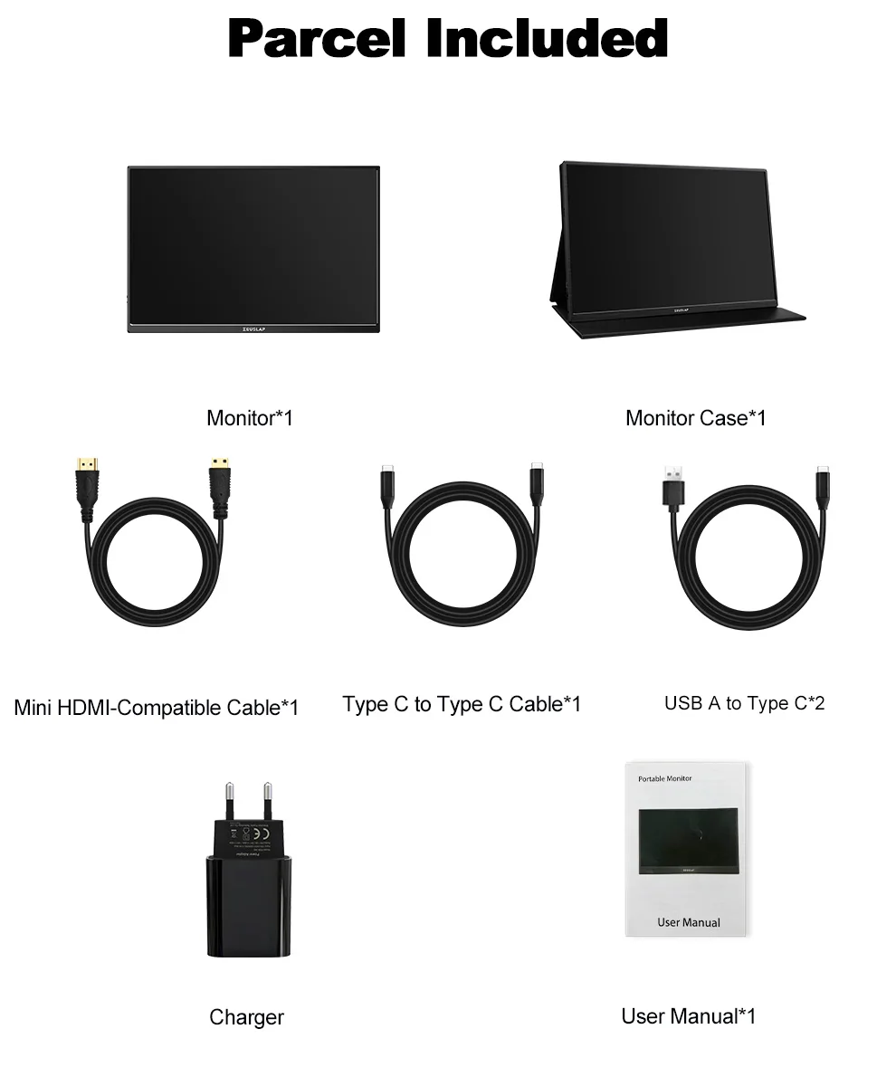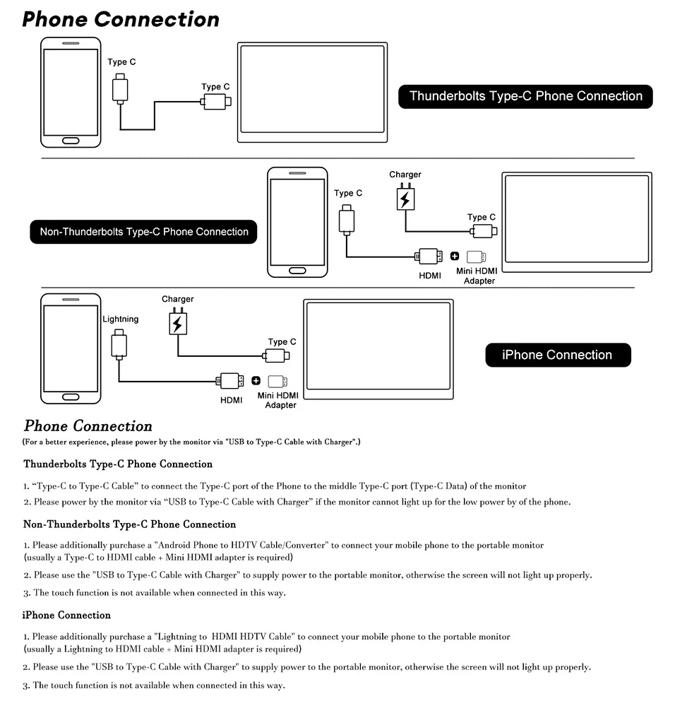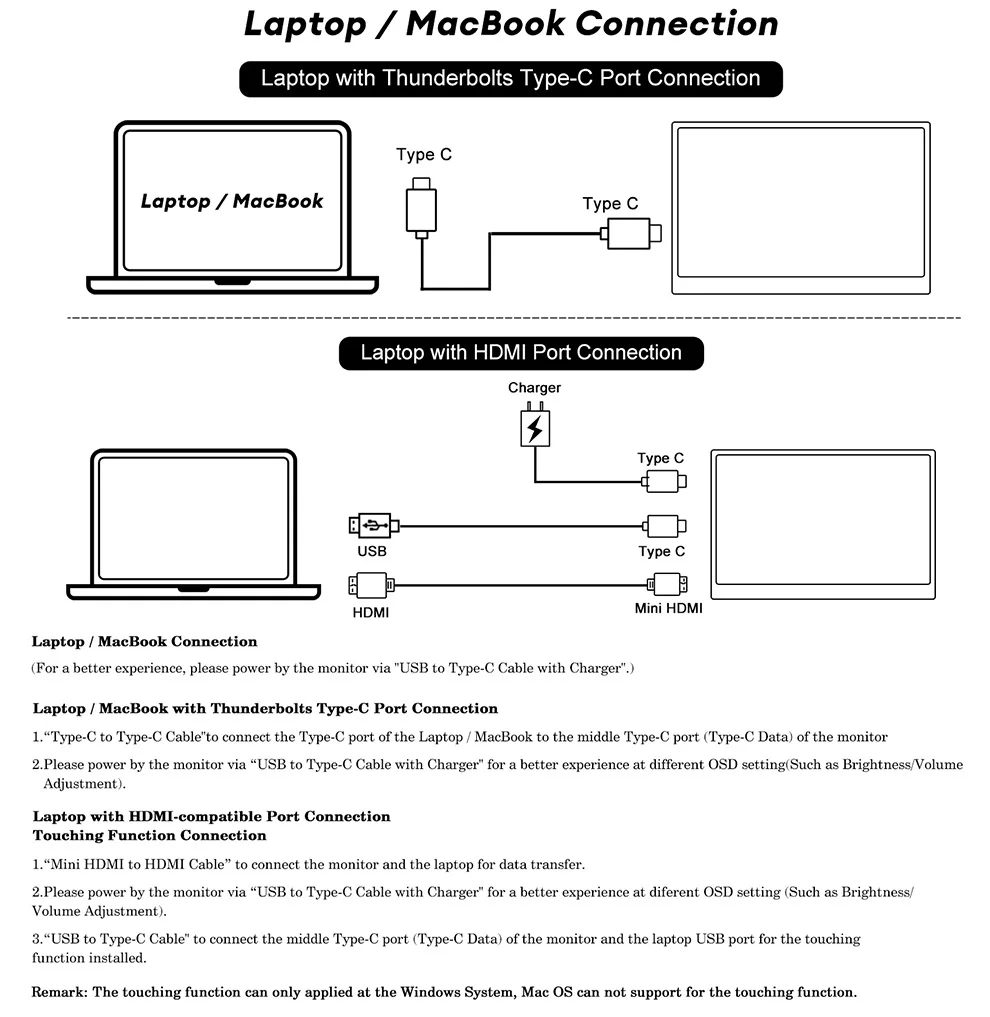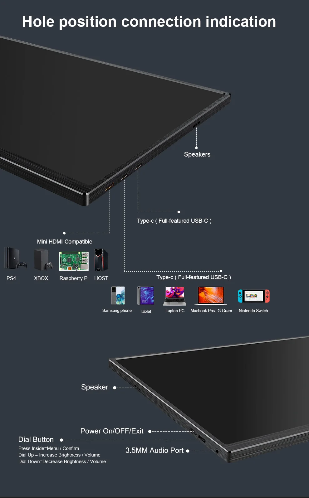 R: Todos estos dispositivos están conectados con el monitor a través de una conexión compatible con HDMI. Primero: alimentación por el monitor con el cargador incluido (conecte el puerto PD tipo C); En segundo lugar, Mini cable compatible con HDMI para conectar el dispositivo y el monitor.