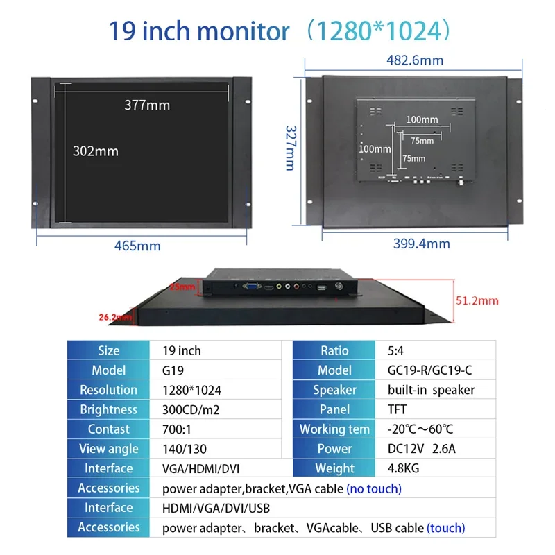 Relación 4:3 de 19 pulgadas, 1280*1024, interfaz: HDMI VGA DVI USB.