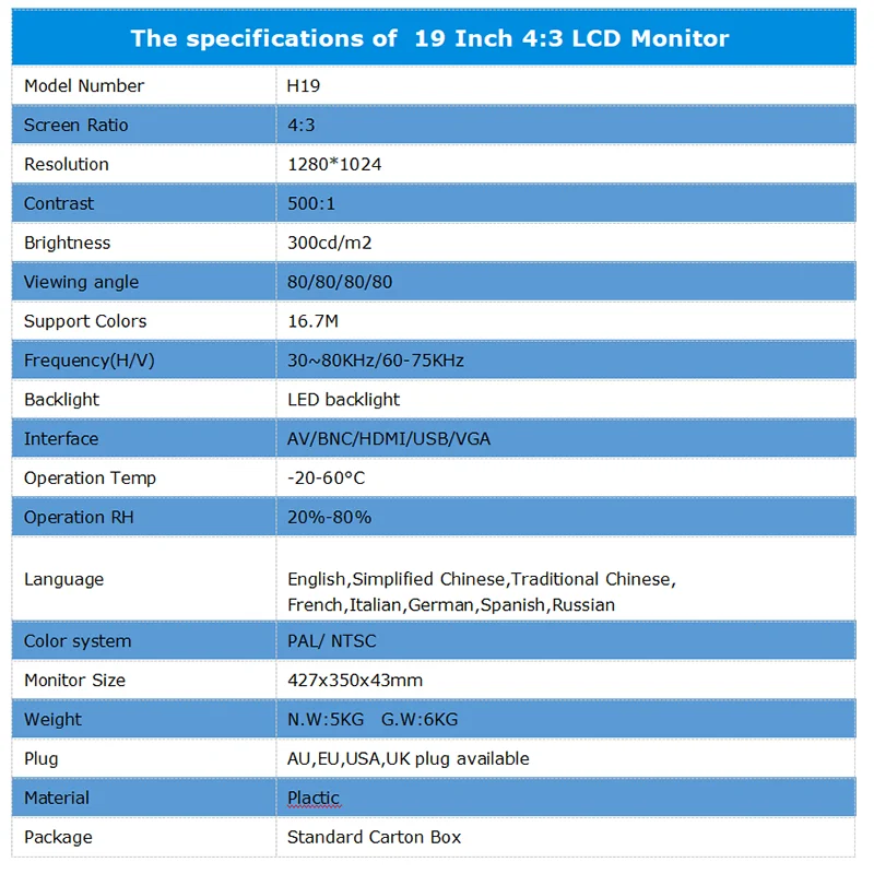 Si desea obtener más información, también tenemos muchos tipos de monitores, por favor deme su correo electrónico, le enviaré los detalles completos de los productos en PDF que incluye las fotos de los productos con su medida
