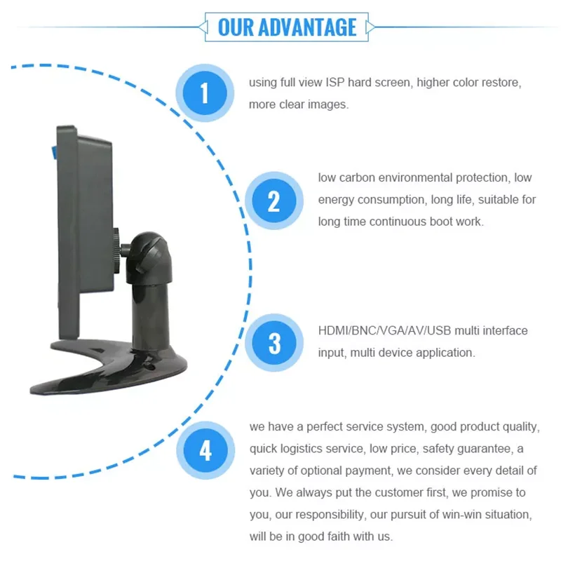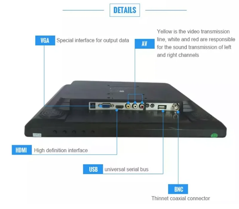 2. El Monitor es multifuncional y está diseñado para satisfacer los diferentes deseos de uso de diferentes clientes. Proporcionó varios puertos de entrada de video diferentes, incluyendo 1 puerto HDMI para juegos, Raspberry Pi, DSLR, DVR u otros dispositivos con uso de Puerto HDMI, conectándolo con un dispositivo de TV, puedes usarlo como un televisor pequeño. 1 puerto VGA para ordenador o portátil. 1 puerto AV para DVD, VCD, TV-Box o cámara de seguridad con puerto AV, etc.