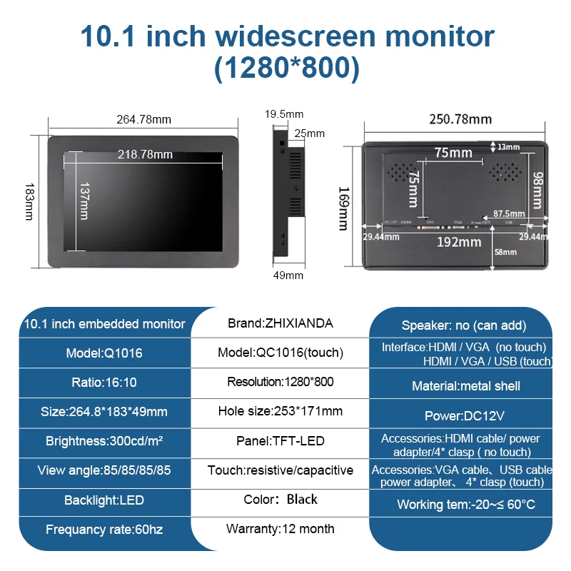 Las especificaciones del monitor LCD integrado de 10.1 pulgadas 16:10