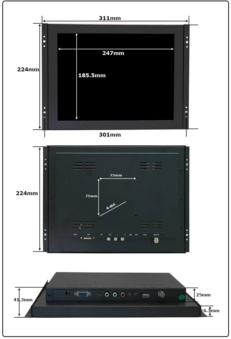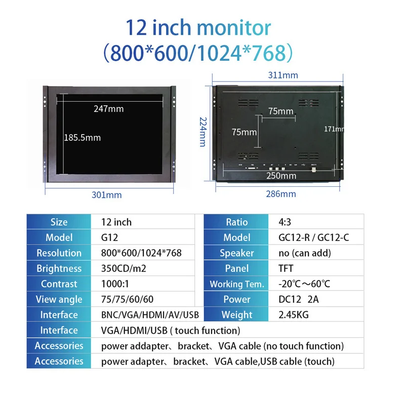 Las especificaciones del monitor industrial de 12 pulgadas 4:3