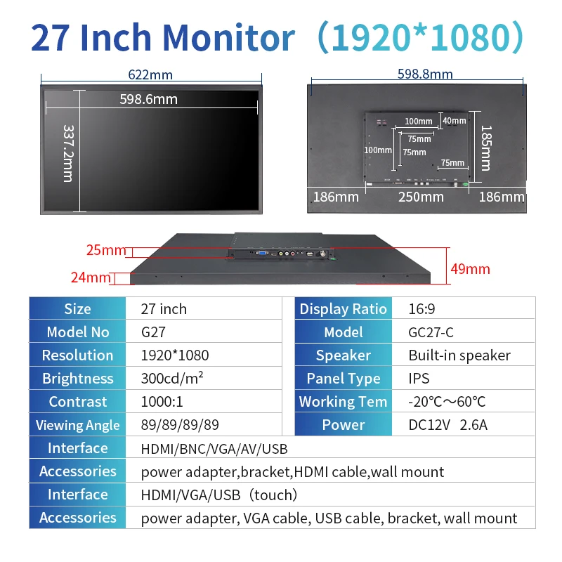 Las especificaciones del monitor de Marco abierto industrial 16:9 de 27 pulgadas