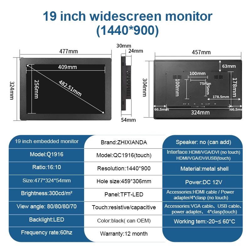 Comprar ZHIXIANDA Widescreen Touch Display 19 Inch VESA Mount Embedded Monitor 1440*900 with HD VGA DVI Input for Industry Automation