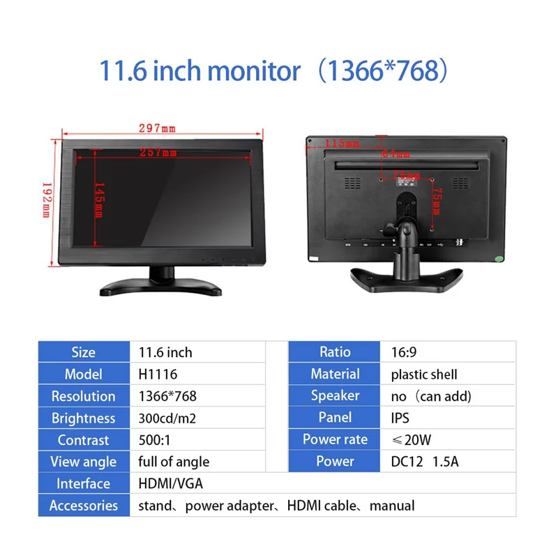 Comprar Zhixianda11,6 "pantalla IPS 1366*768 ángulo de visión completo, pantalla LED de escritorio para TV de coche, Monitor de ordenador con puerto VGA de HD-MI