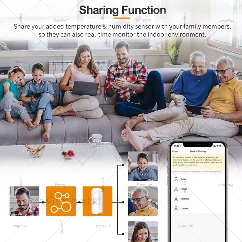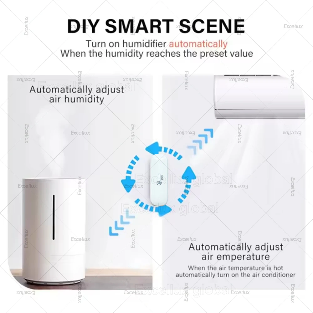 4.Nuevo agregado con técnica de compensación de temperatura con conexión de escena inteligente a su aire acondicionado y humidificador, ofreciendo a su casa la temperatura y humedad más cómodas para disfrutar de nuestra vida inteligente.(Tienda global Excellux)