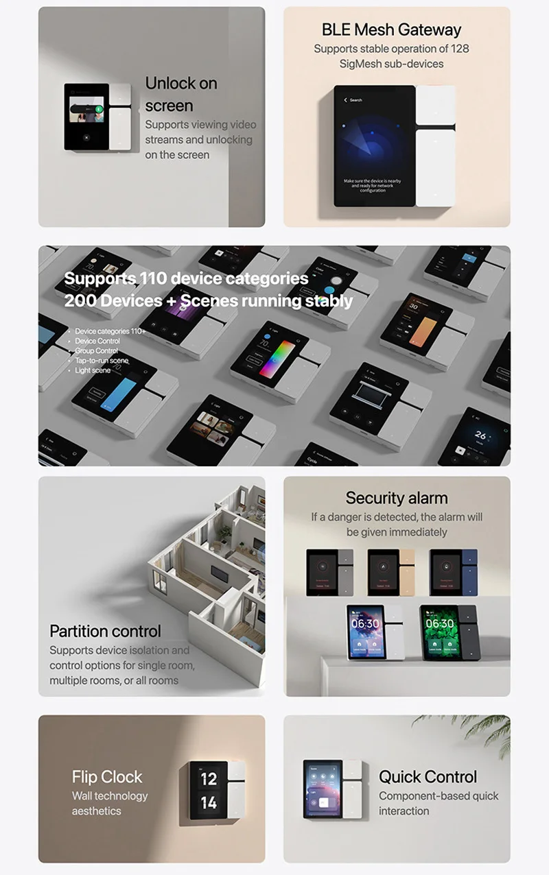 5.Diseño de botones asimétricos: el panel de control de pantalla táctil multifuncional presenta un diseño de botones asimétricos de dos segmentos de tres zonas con tres LED de control remoto por infrarrojos empotrados, lo que maximiza el ángulo de control por infrarrojos para una mejor gestión del dispositivo.Admite más de 110 categorías de dispositivos, número ilimitado de dispositivos y escenas, y admite 12 categorías de control de dispositivos infrarrojos.