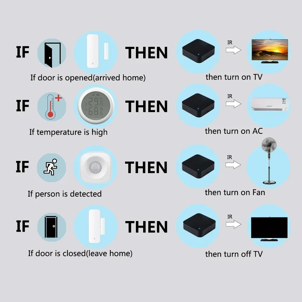 Al crear una "Automatización" en la aplicación e interactuar con otros dispositivos domésticos inteligentes Tuya, el control remoto universal puede ejecutar acciones automáticamente según las condiciones, como el estado del dispositivo, el clima y la hora.Tenga en cuenta: El sensor de puerta, el sensor de temperatura y el sensor de movimiento no están incluidos en el paquete.