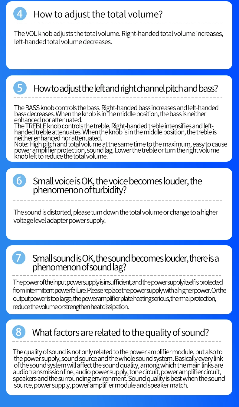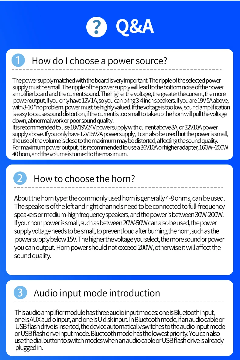 ¡Cuanto mayor sea el voltaje de la fuente de alimentación, mayor será la potencia de salida, menor será la impedancia de la bocina y mayor será la potencia de salida!