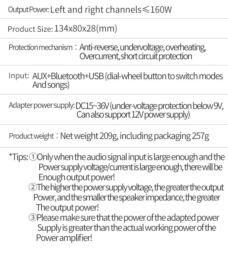 Consejo: cuando la entrada de señal de audio es lo suficientemente grande y el voltaje/corriente de la fuente de alimentación es lo suficientemente grande, ¡habrá suficiente potencia de salida!