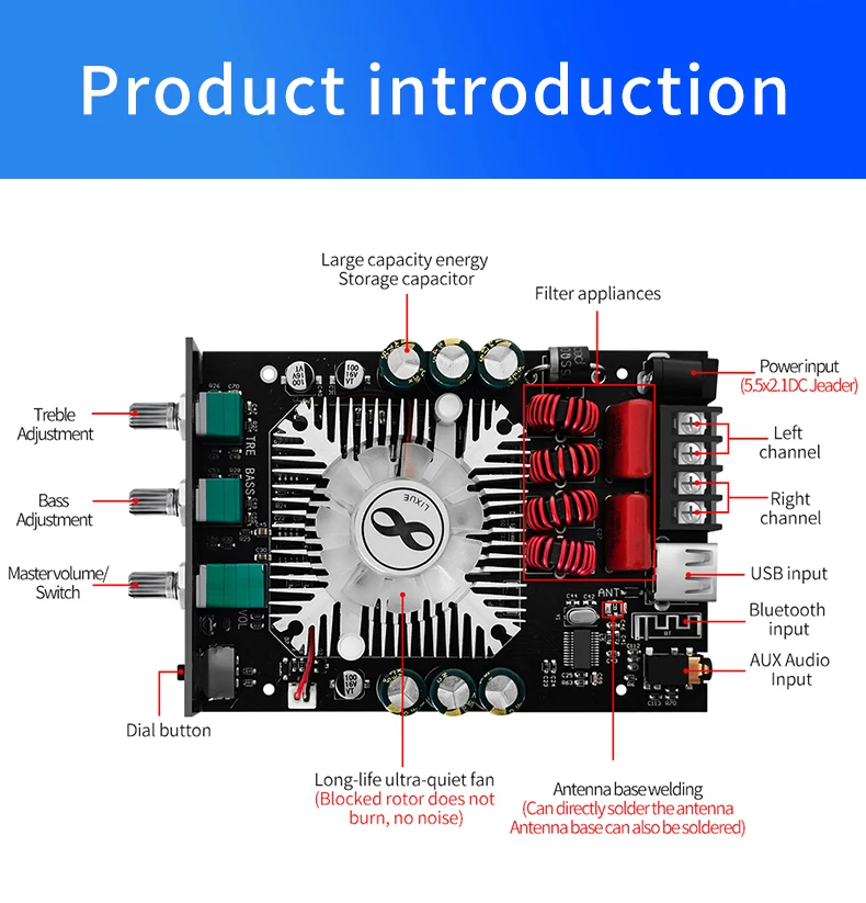 Lo recibí hoy y lo estoy usando ahora, muy satisfecho. Al principio, pensé que era un incendio por el ruido fuerte del enfriador. Sin embargo, cuando desconecté el cable de alimentación del enfriador debido al contacto con el mismo, el ruido disminuyó y se volvió silencioso. No pude encontrar un adaptador de corriente de 24V, así que estoy usando uno de 19V 3.42A. La calidad del sonido es muy buena, los graves también son buenos. Estoy esperando aumentar la salida comprando un adaptador de 24V 5A. Considerando el precio, califico este producto como excelente.
