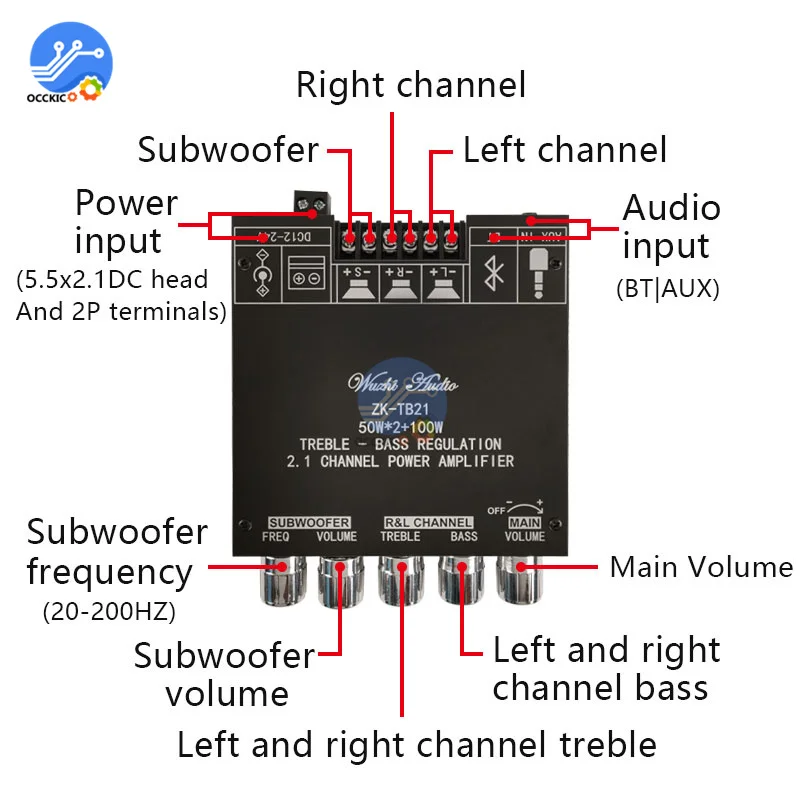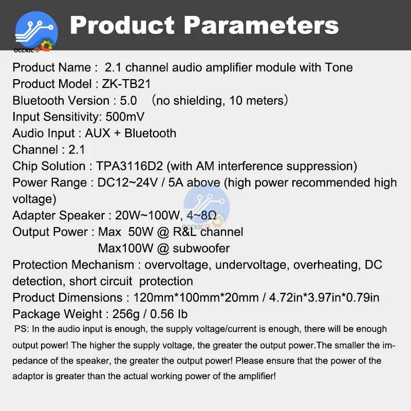 Nombre del producto: Módulo amplificador de audio Bluetooth de 2.1 canales Modelo de producto: ZK-TB21