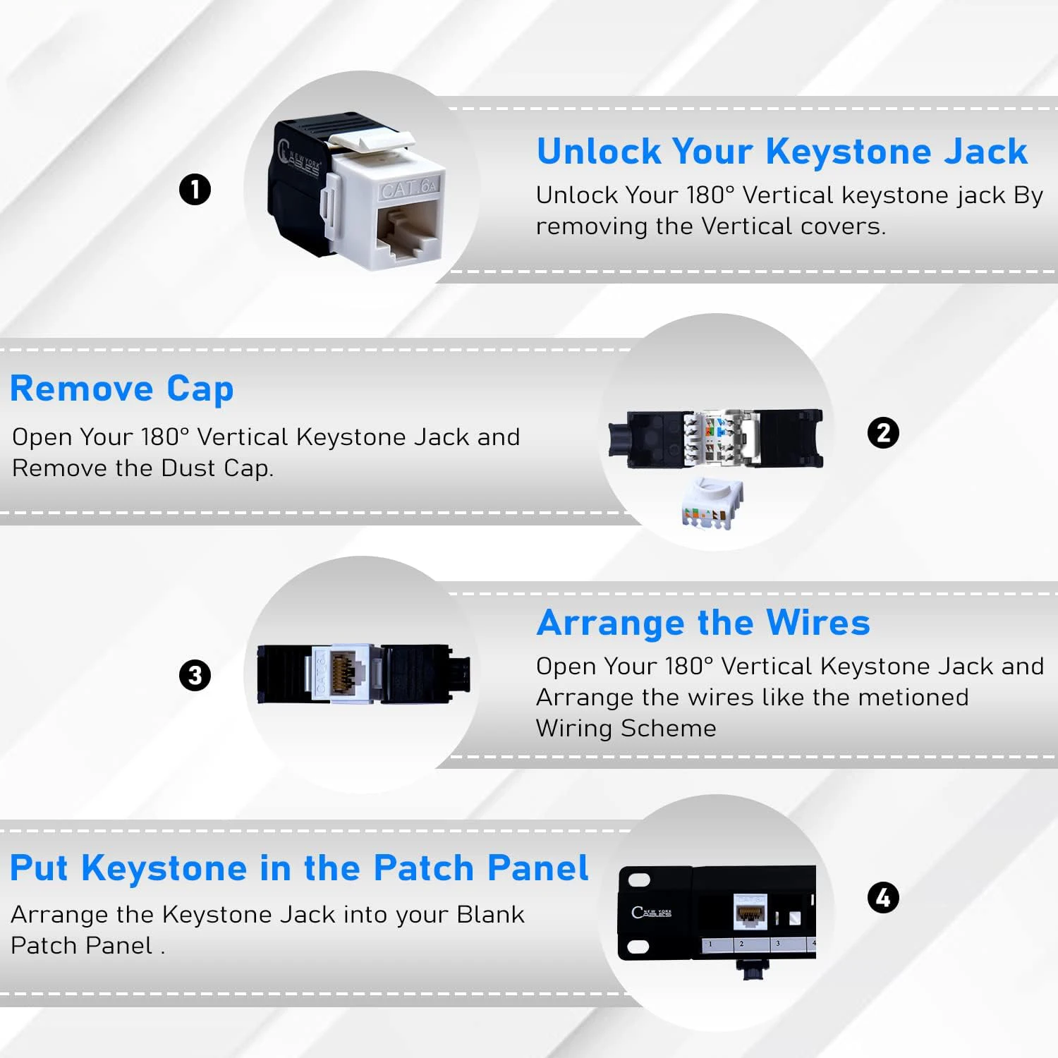 La construcción superior combina una trapezoidal de metal de una sola pieza con un cilindro silenciador integrado para suprimir el ruido electromagnético y la SIGUIENTE;La cinta de lámina de cobre y las bridas para cables garantizan una instalación profesional y un escudo adicional;El conector Keystone Cat8 a presión con un clip de retención garantiza una conexión segura