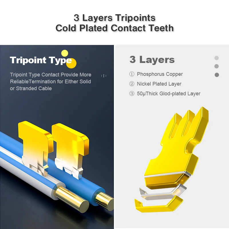 Los enchufes pasantes utilizan una hoja de contacto de 3 puntas que se adapta tanto a cables trenzados como a cables sólidos.El diseño de paso le permite deslizar 4 pares de cables completamente en la ranura, lo que puede simplificar la terminación de los cables y ahorrar tiempo.