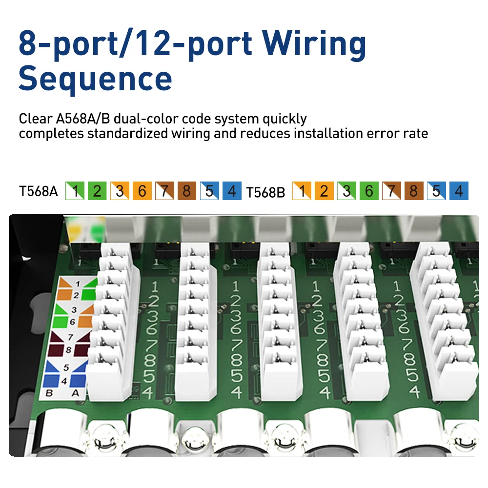 Cuenta con una secuencia de cableado de 8 o 12 puertos con un sistema de codificación transparente de dos colores T568A/B, lo que garantiza un cableado estandarizado y reduce los errores de instalación.