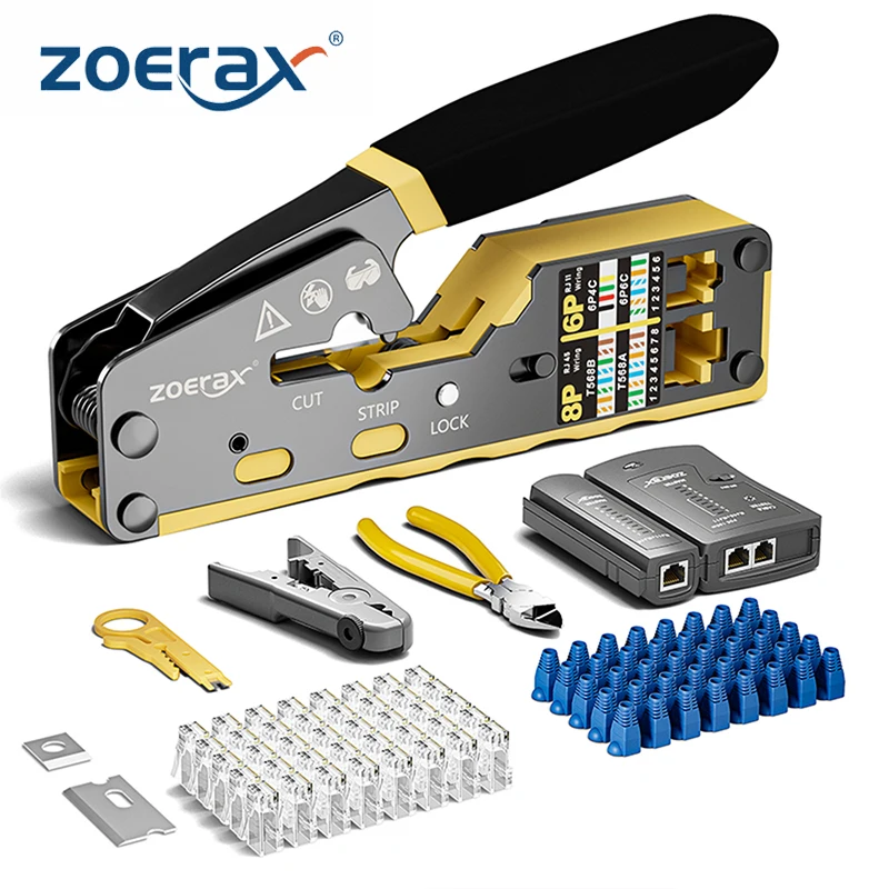 Comprar ZoeRax 8 en 1 Kit de herramientas de engarzado RJ45, herramienta de engarzado, probador de cables, cortador de cables, cuchillas, 50 conectores Cat 6 y botas de alivio de tensión
