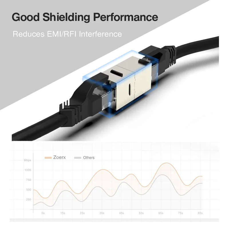 2. La carcasa blindada protectora reduce las interferencias EMI/RFI y los contactos chapados en oro de 50Ω en conectores RJ45.