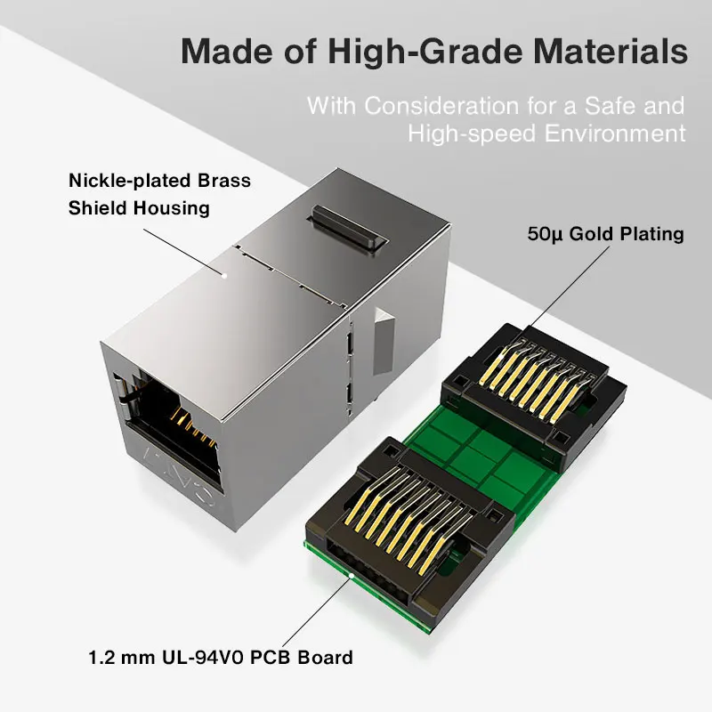 2. La carcasa blindada protectora reduce las interferencias EMI/RFI y los contactos chapados en oro de 50Ω en conectores RJ45.