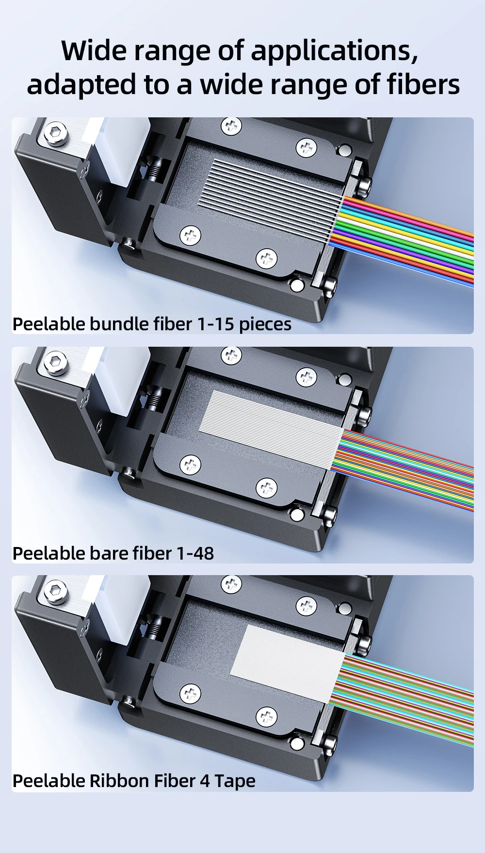 Esta herramienta permite pelar térmicamente hasta 48 fibras a la vez, mejorando significativamente la eficiencia del trabajo durante la preparación de las fibras.