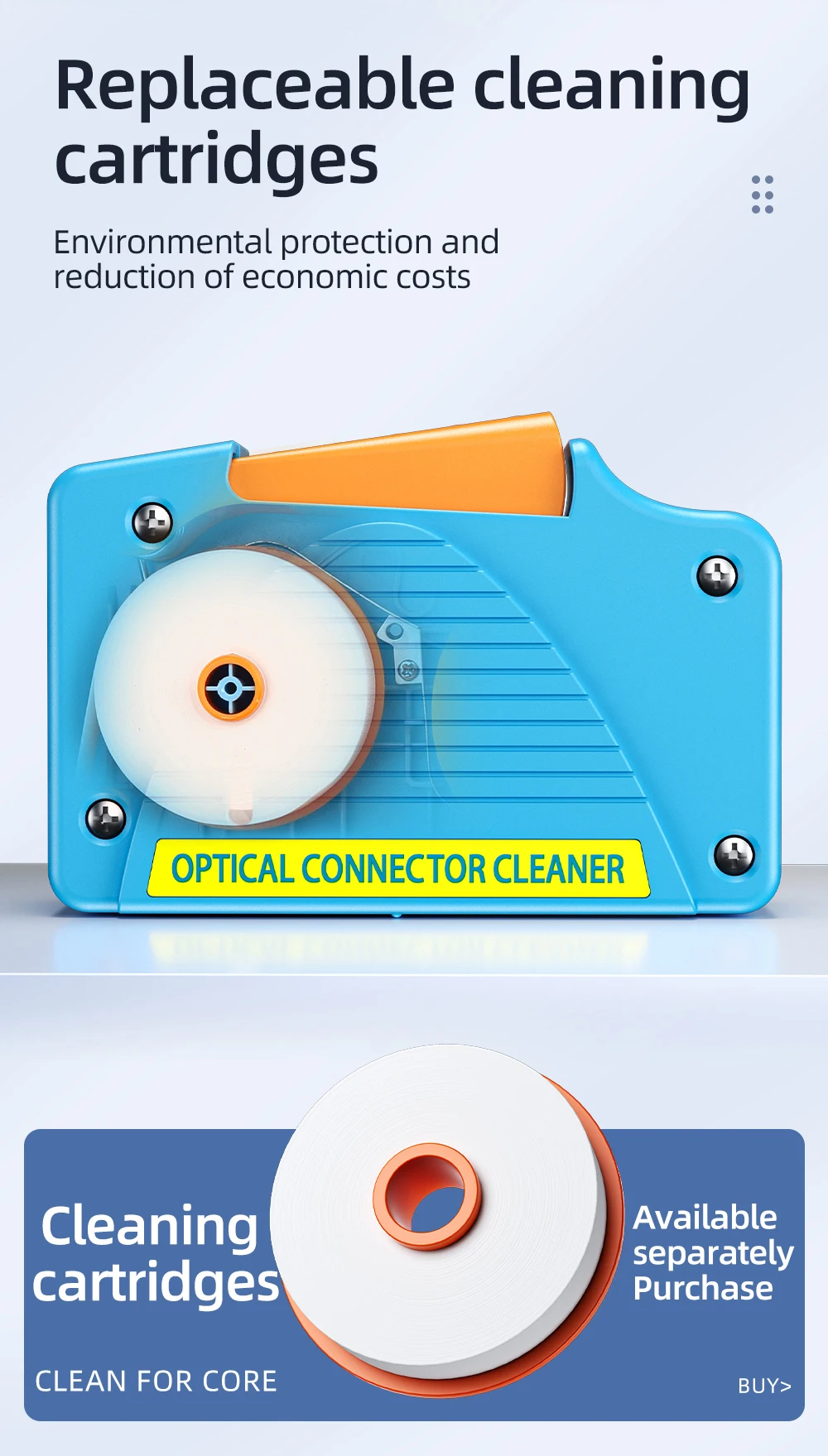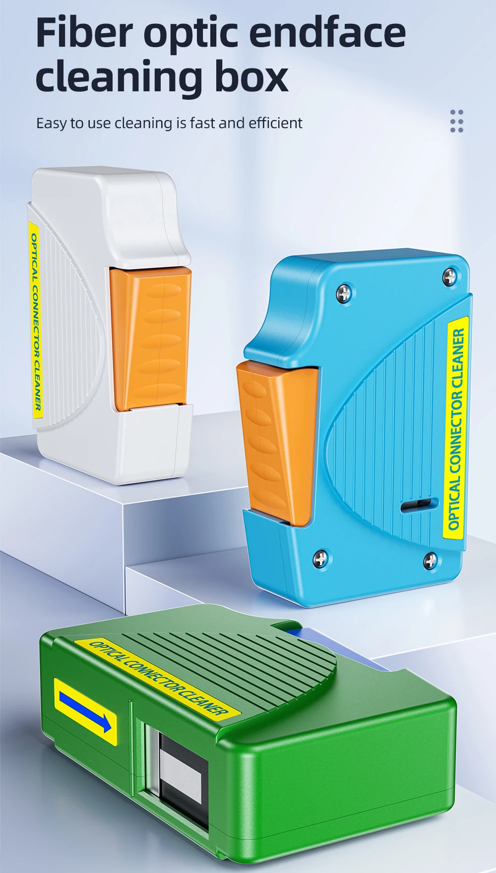 Fácil de usar, esta caja de limpieza ofrece una limpieza rápida y eficiente para conectores FC/SC/ST/LC, con más de 550 usos.