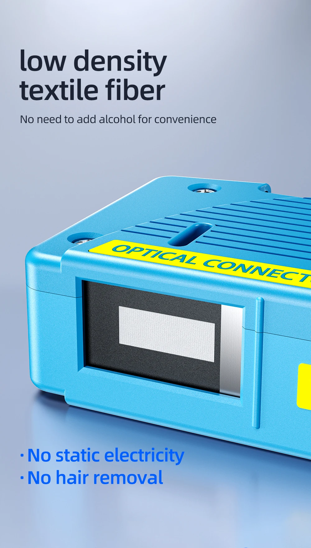 Elaborado con fibras textiles de baja densidad, no requiere alcohol, evitando la electricidad estática y la depilación durante la limpieza.