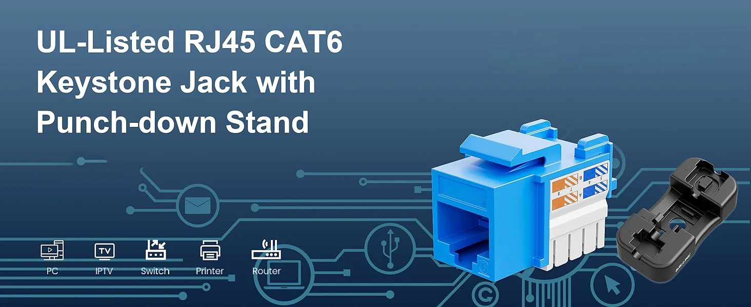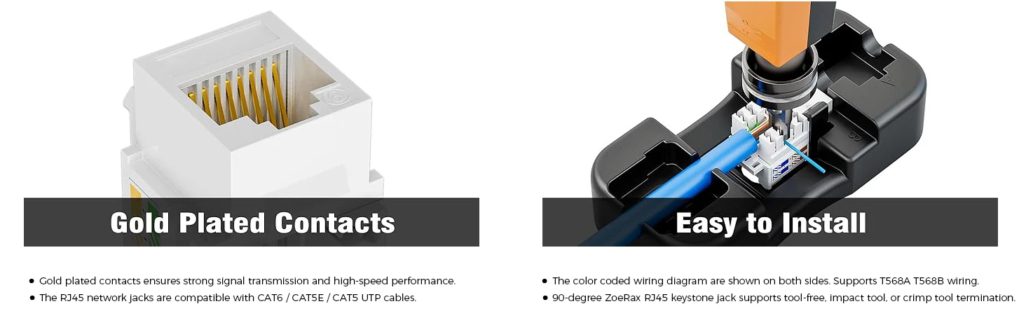 ZoeRax Cat6 Keystone Jack RJ45 Keystone Jack y Keystone Punch Down Stand, conector de 90 grados (no compatible con Patch Panel)
