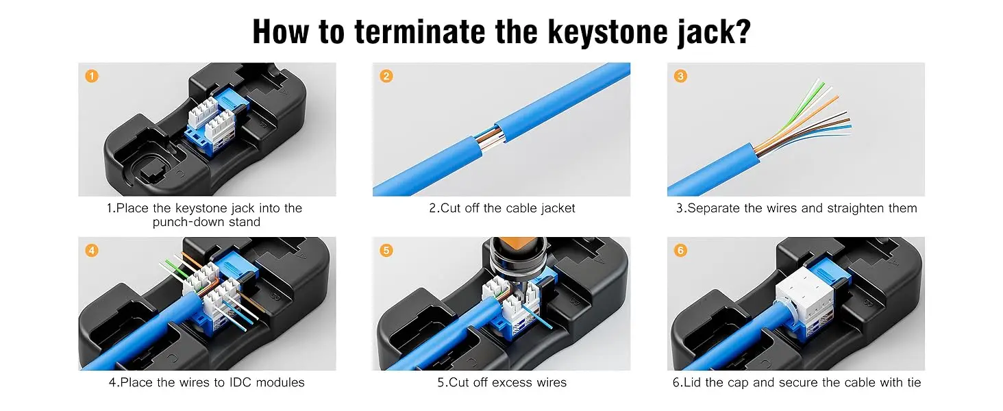 【PUNCH-DOWN STAND】 Los conectores RJ45 Keystone están equipados con un soporte de perforación. El soporte para perforar protege sus manos de la herramienta de perforación afilada. Los terminales IDC aceptan la herramienta de impacto y proporcionan alivio de tensión del cable.