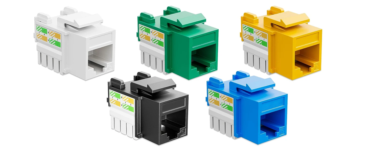 【ZoeRax ETHERNET KEYSTONE】La construcción resistente incluye una carcasa resistente a impactos e ignífuga con contactos RJ45 chapados en oro, cubiertas duales IDC, una brida para cables, y un clip de retención a presión para una conexión segura.