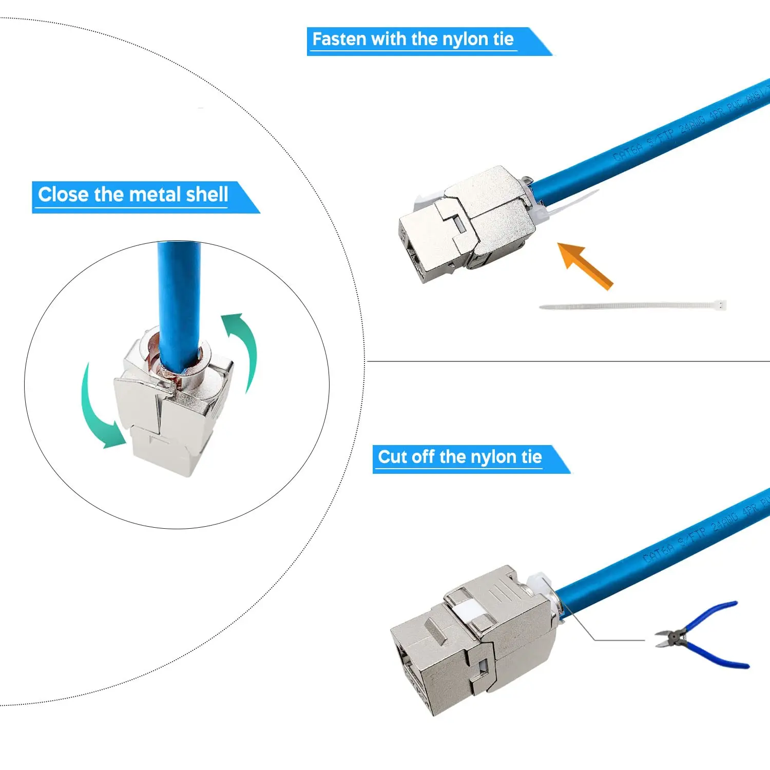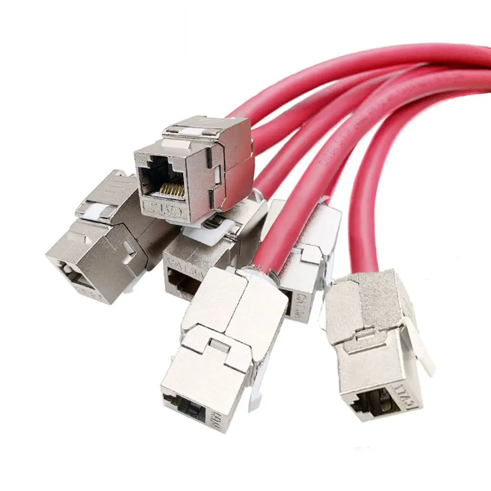 Chaqueta totalmente metálica RJ45 Las tomas trapezoidales blindadas se adaptan a una placa de pared o panel de conexión estándar con una salida en blanco trapezoidal; Admite cables sólidos o trenzados de 22 a 26 AWG.