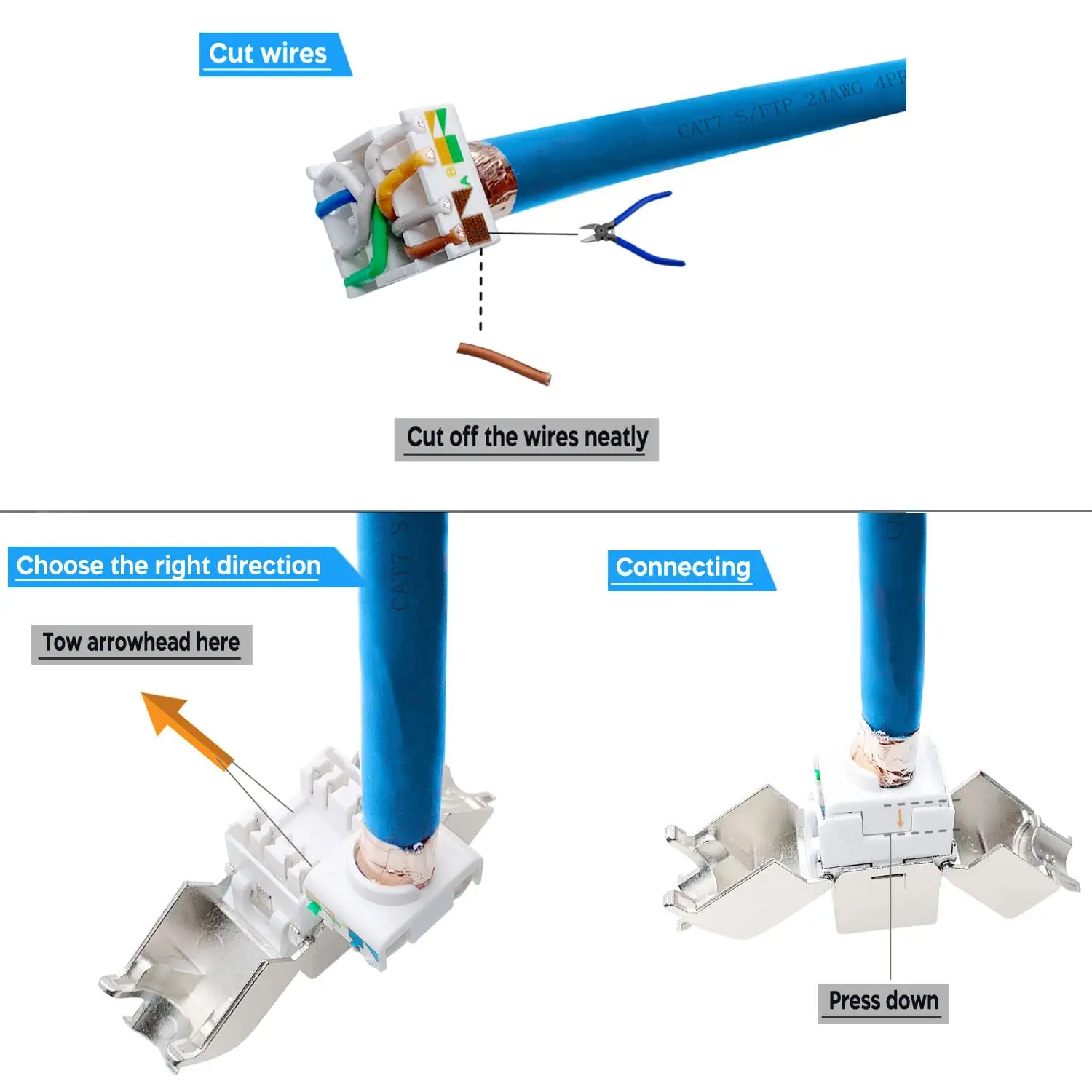El conector de terminación fácil de 180 grados admite la terminación sin herramientas, de herramientas de impacto o de herramientas de engarce; Los módulos IDC duales tienen etiquetas universales T568-A o T568-B y aceptan un kit de terminación de herramientas 110 o Krone