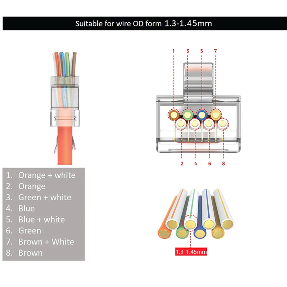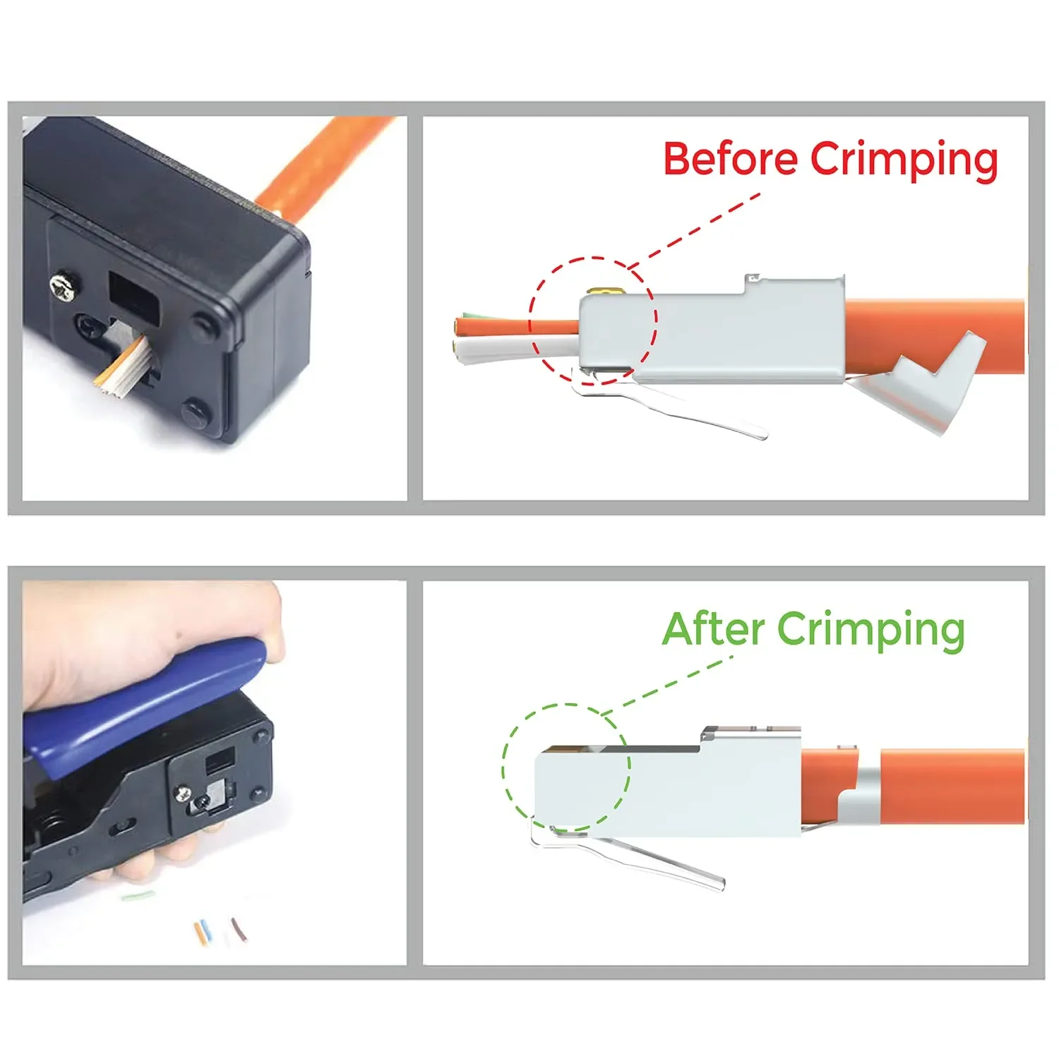 El conector blindado de CABLE RJ45 de bricolaje termina el cable sólido de par trenzado blindado para hacer cables de conexión Ethernet de longitud personalizada; Admite cable sólido o trenzado CAT6A CAT7 STP/FTP 23 AWG redondo, para núcleo de cable OD 1,35 ~ 1,45 mm.El diámetro exterior del cable de los cables con las mismas especificaciones AWG puede variar según el fabricante.Asegúrese de que el diámetro exterior del cable DEBE cumplir con los requisitos.(Cable plano no compatible debido a una instalación difícil)