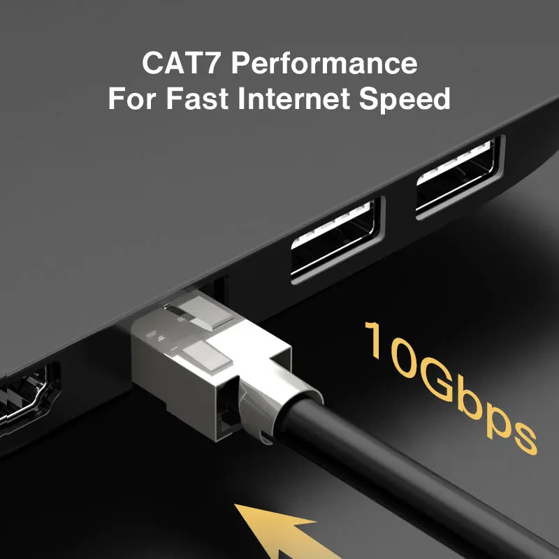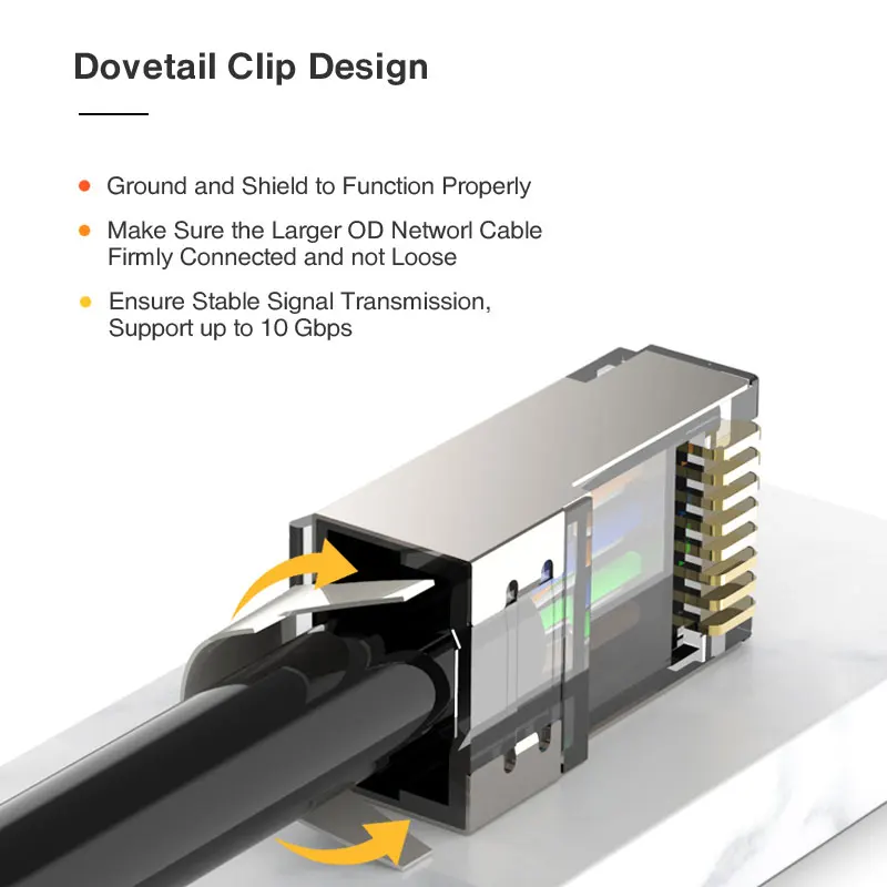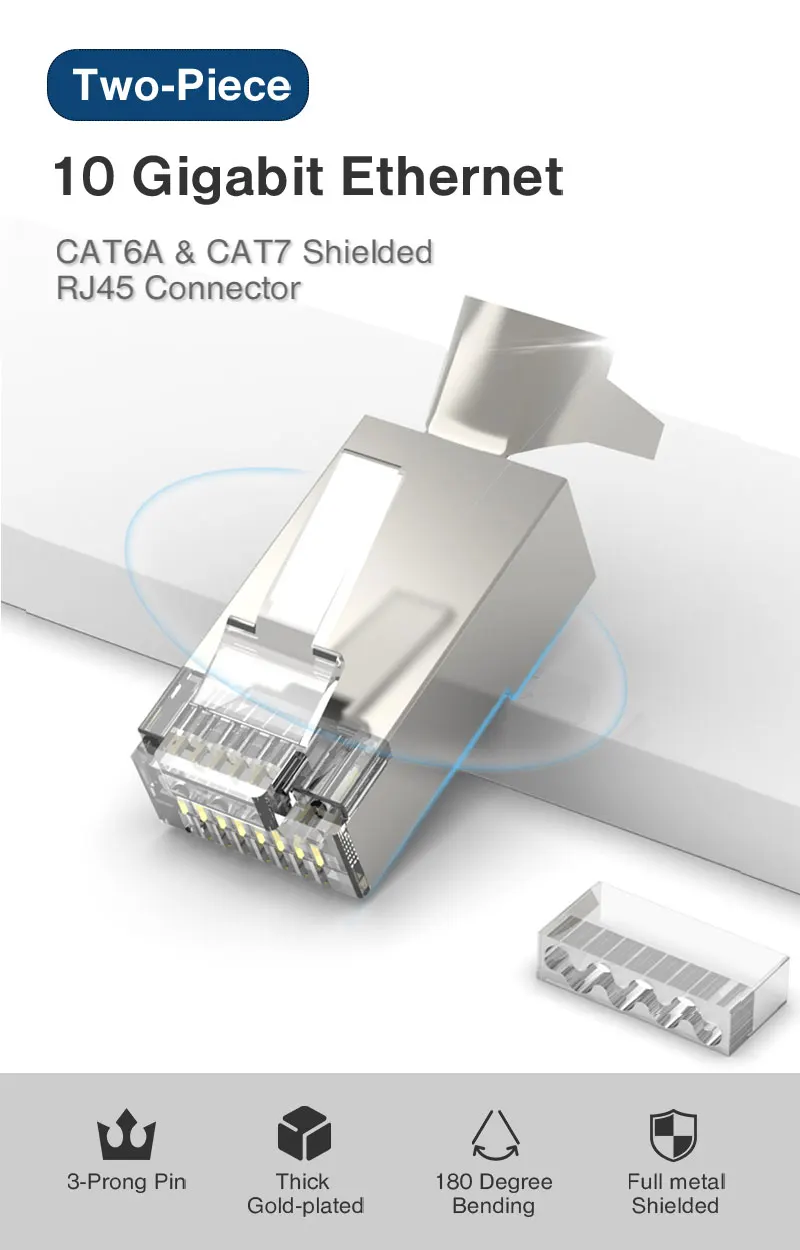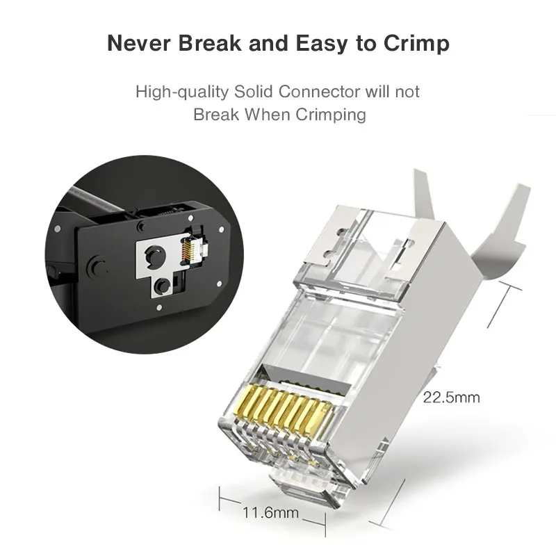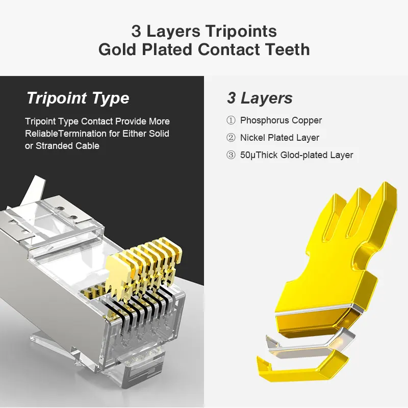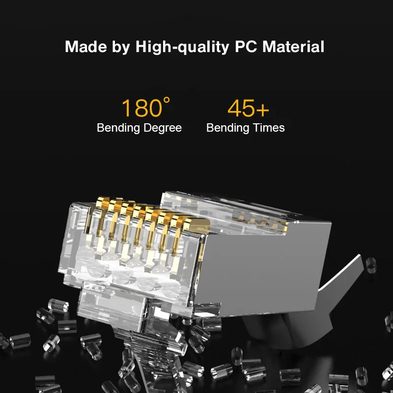 Los conectores CAT7 RJ45 fabricados con una carcasa blindada de alto rendimiento y los gruesos contactos chapados en oro de tres puntas chapados en oro garantizan una velocidad de transferencia de datos rápida, reducen la diafonía alienígena de par, y mejora en gran medida la inmunidad al ruido en todas las frecuencias.