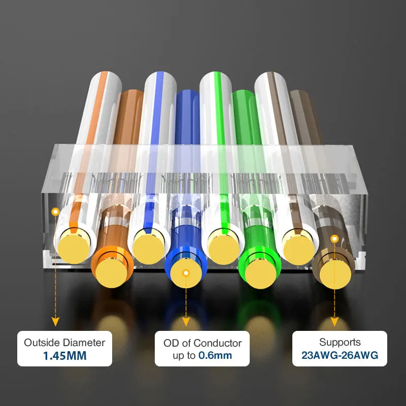 Los enchufes modulares Rj 45 aceptan cable blindado o sin blindaje de 23 a 26 AWG. El diámetro exterior del conductor aislado debe ser inferior o igual a 1,5mm. Adecuado para cables CAT7 y compatible con POE; Se utiliza para CCTV, enrutadores, interruptores, impresoras, concentradores, PC y servidores.