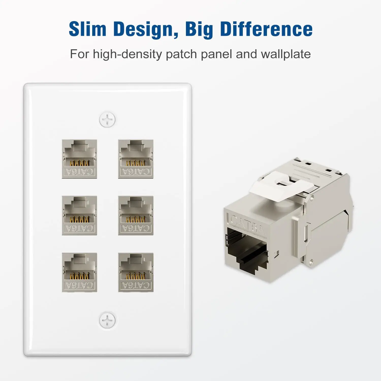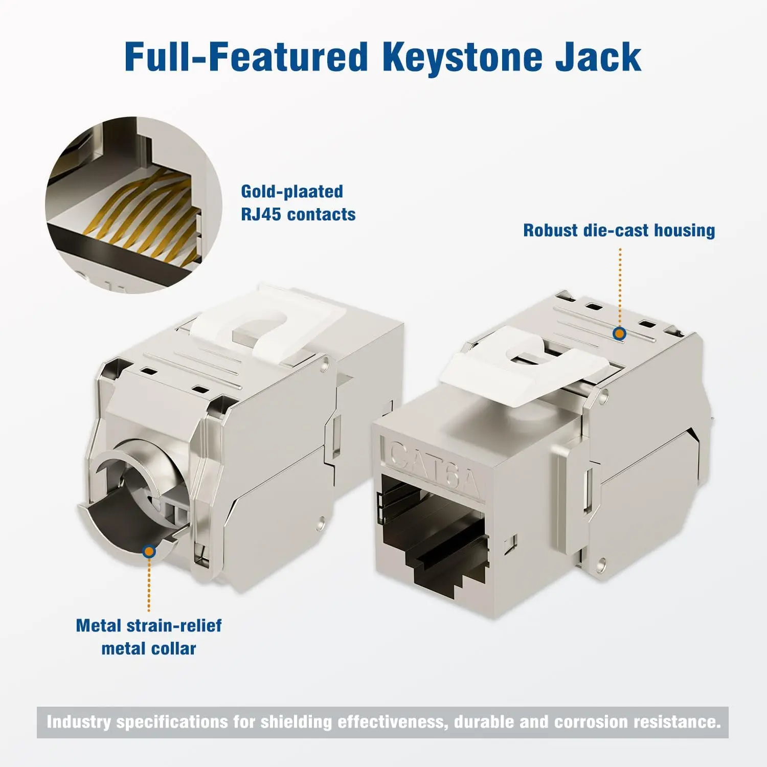 Los conectores de metal blindado RJ45 Cat6A Cat7 Cat8 Keystone están diseñados para encajar en placas de pared, paneles de conexión y cajas de conexión de superficie para un despliegue rápido y sin problemas con puertos Keystone de tamaño estándar.