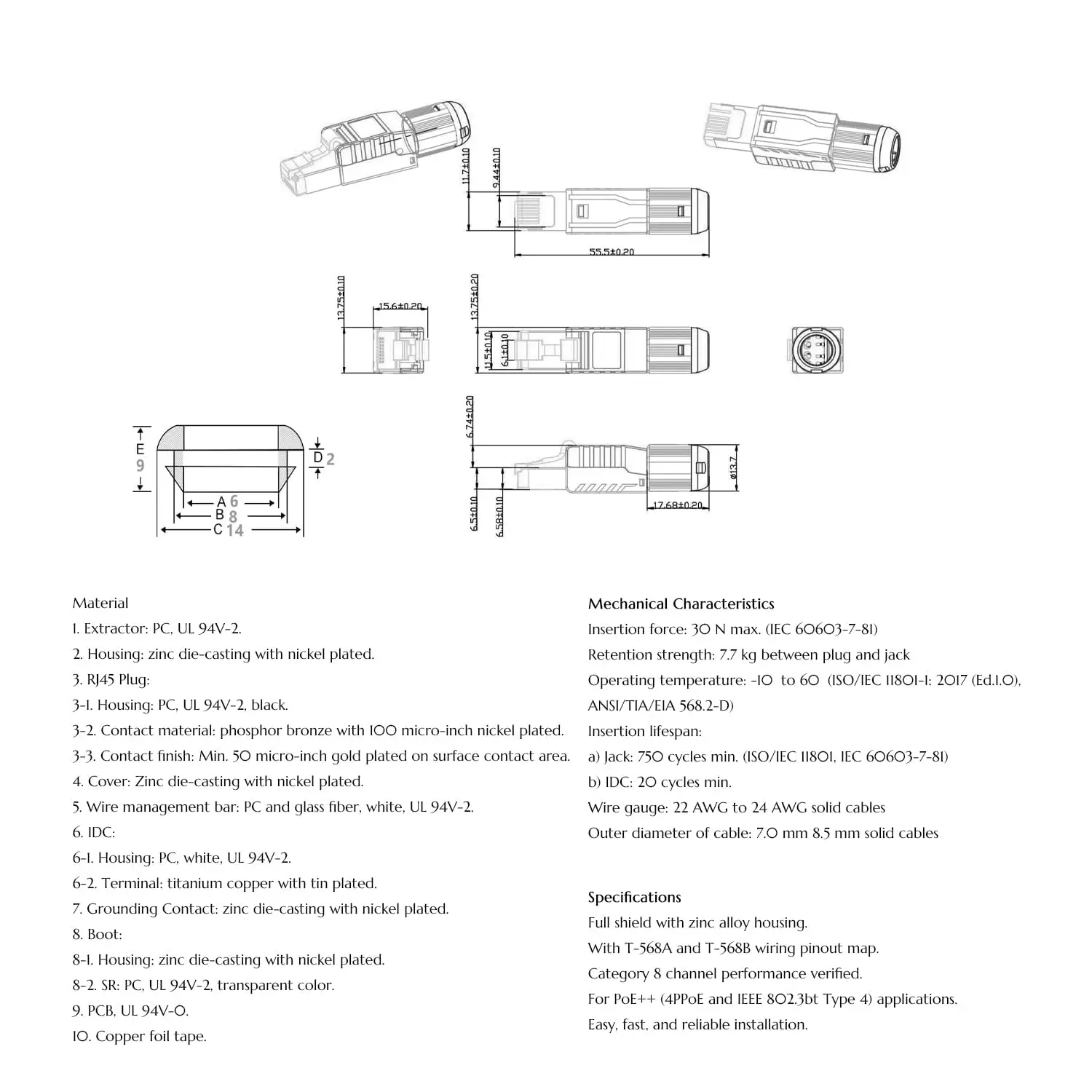 【Compatibilidad】 Admite cable Cat8 AWG blindado de 22 a 24 AWG con un diámetro exterior entre 7,0 y 8,5mm; Compatible con versiones anteriores como conector Cat 6A o Cat 7.