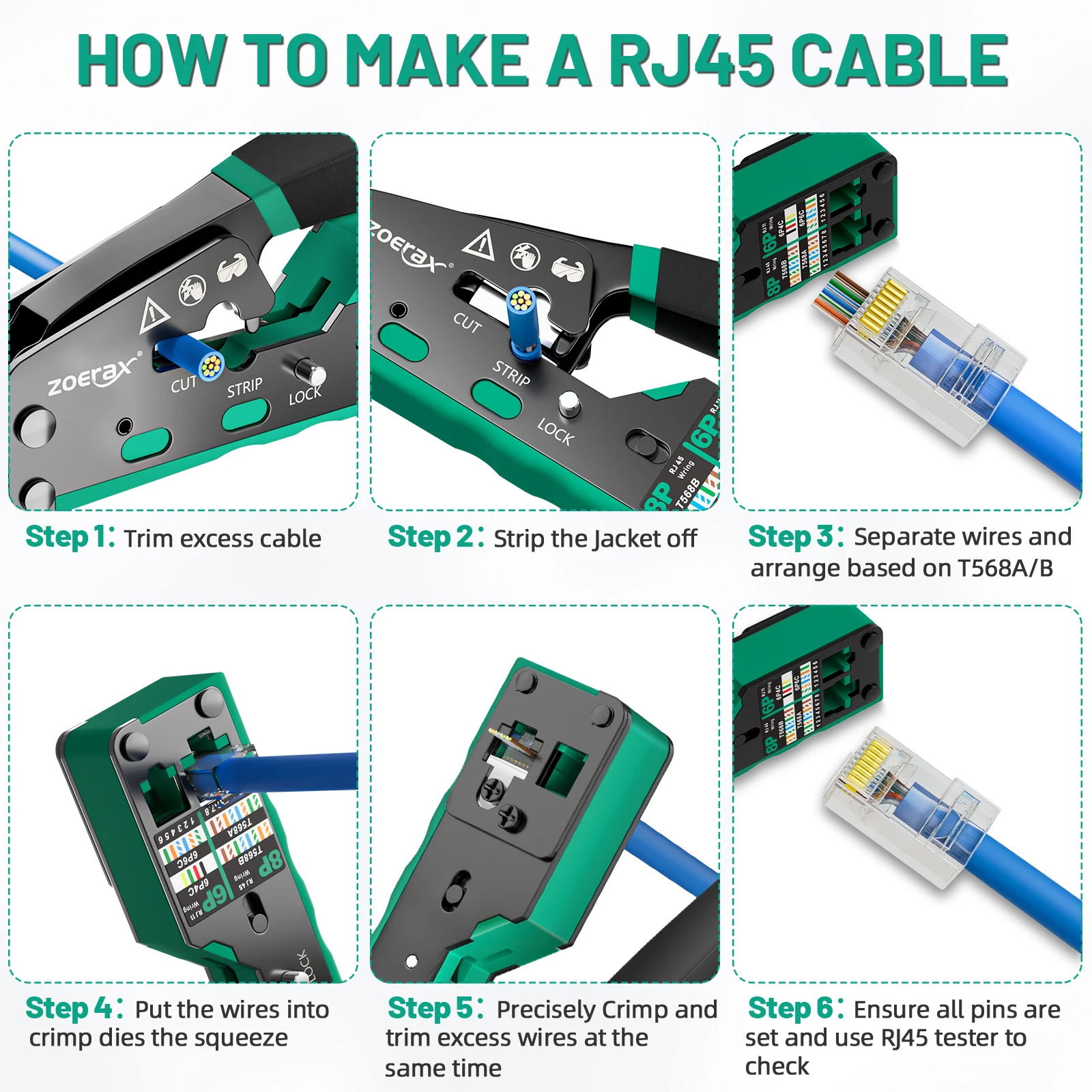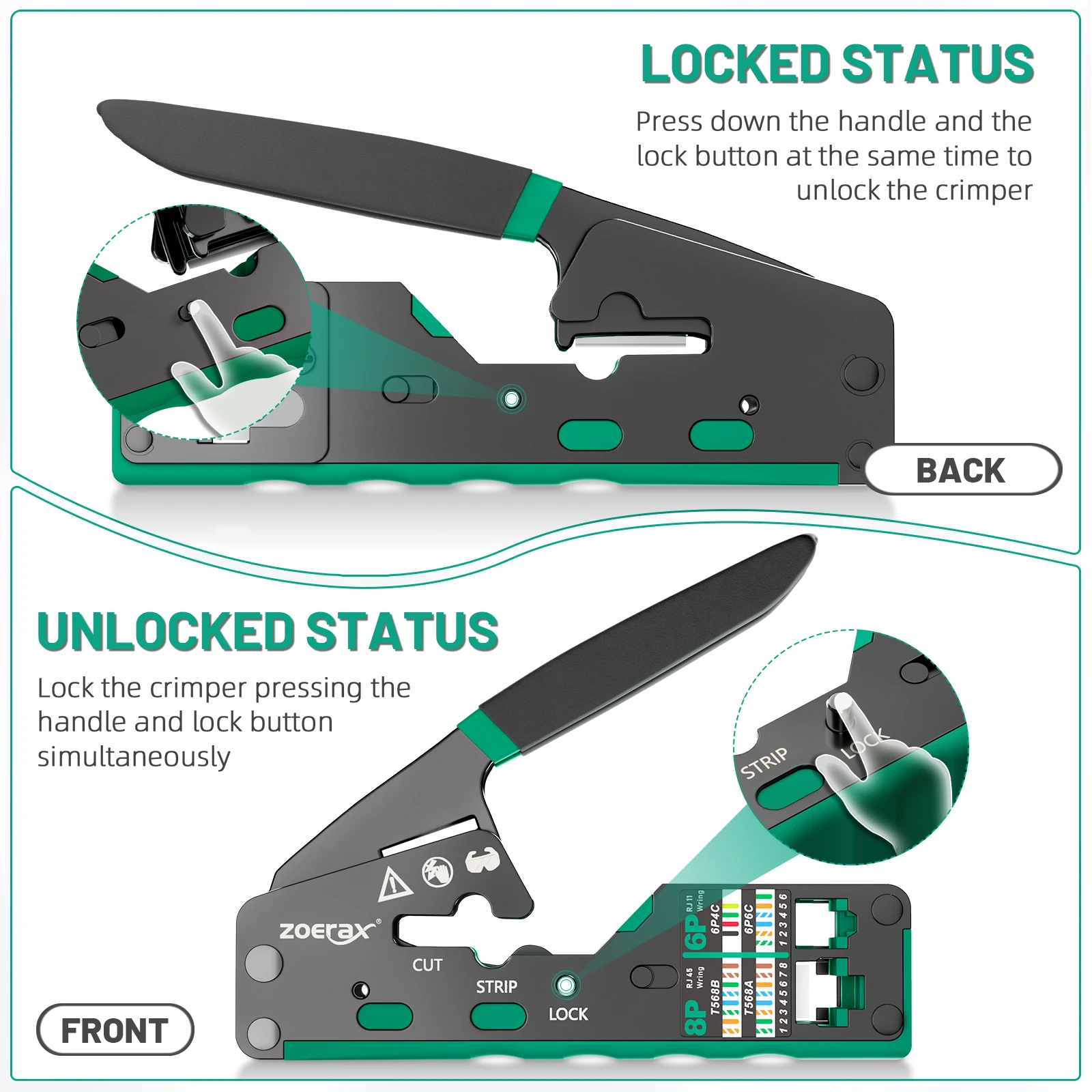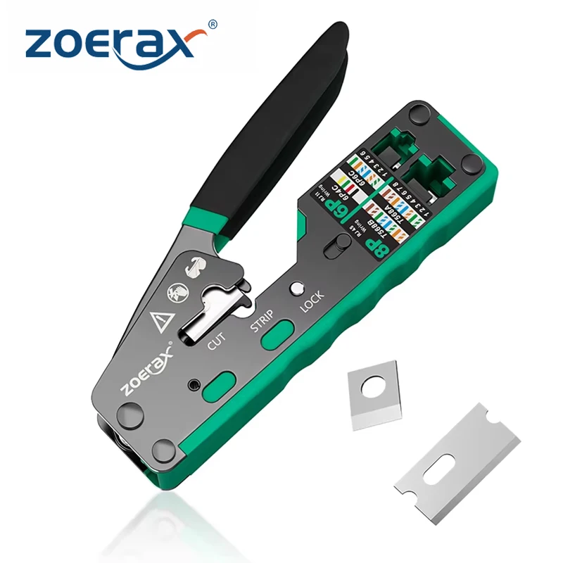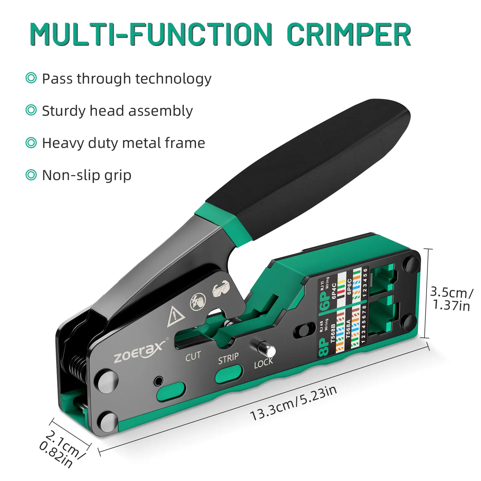 Herramienta de crimpado ZoeRax RJ45, cortador de crimpadora de paso para Cat6a Cat6 Cat5 Cat5e 8P8C, conector Modular Ethernet, herramienta de cable todo en uno