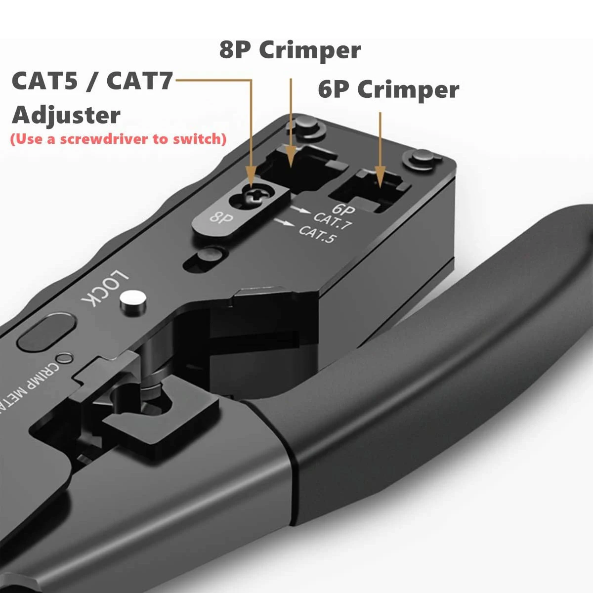 ✅Conmutador Cat7 a Cat5 incorporado: cambie de engaste Cat7 a Cat5 usando un destornillador para aflojar y luego cambie hacia arriba o hacia abajo para cambiar el modo de compresión. Le permite engarzar tanto los conectores blindados CAT6a como los conectores estándar RJ45. El modo Cat7 es sinónimo de crimpado de enchufes blindados Cat7. El modo Cat5 significa crimpado de enchufes Cat5e y Cat6.