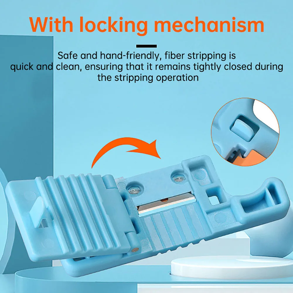 La herramienta cuenta con un mecanismo de bloqueo seguro que garantiza un pelado de fibra seguro, rápido y limpio.La hebilla de bloqueo mantiene la herramienta bien cerrada durante el funcionamiento, lo que brinda tranquilidad al manipular fibras delicadas.