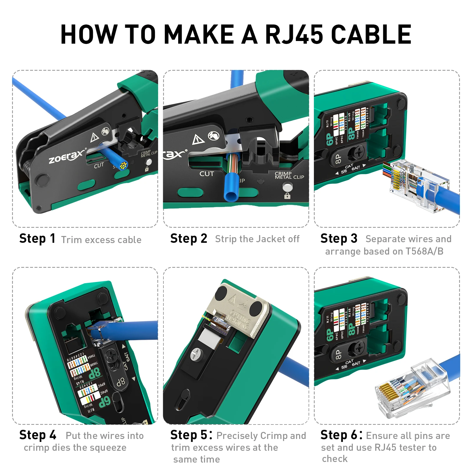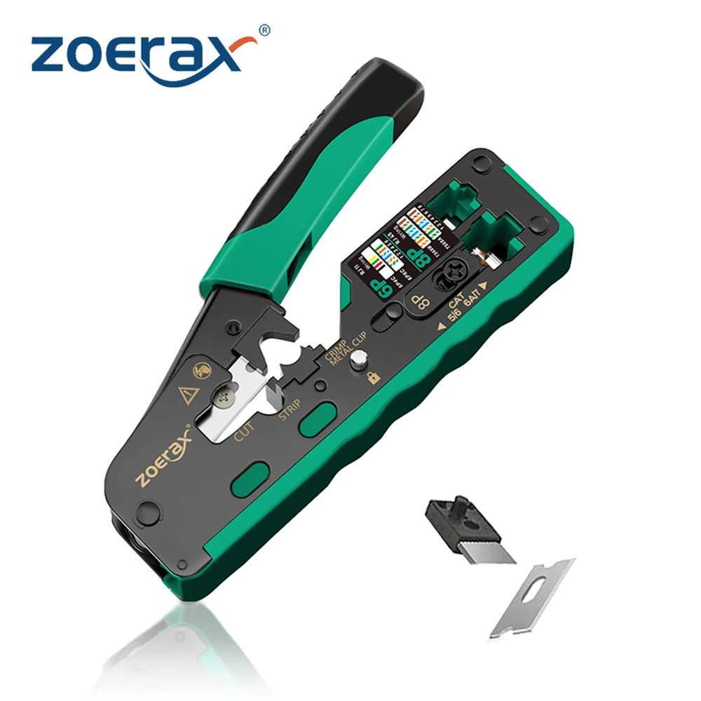 Herramienta de prensado ZoeRax RJ45 para conectores Ethernet Cat7 Cat6a Cat6 Cat5e cortador de cables engarzadora Ethernet con dos cuchillas